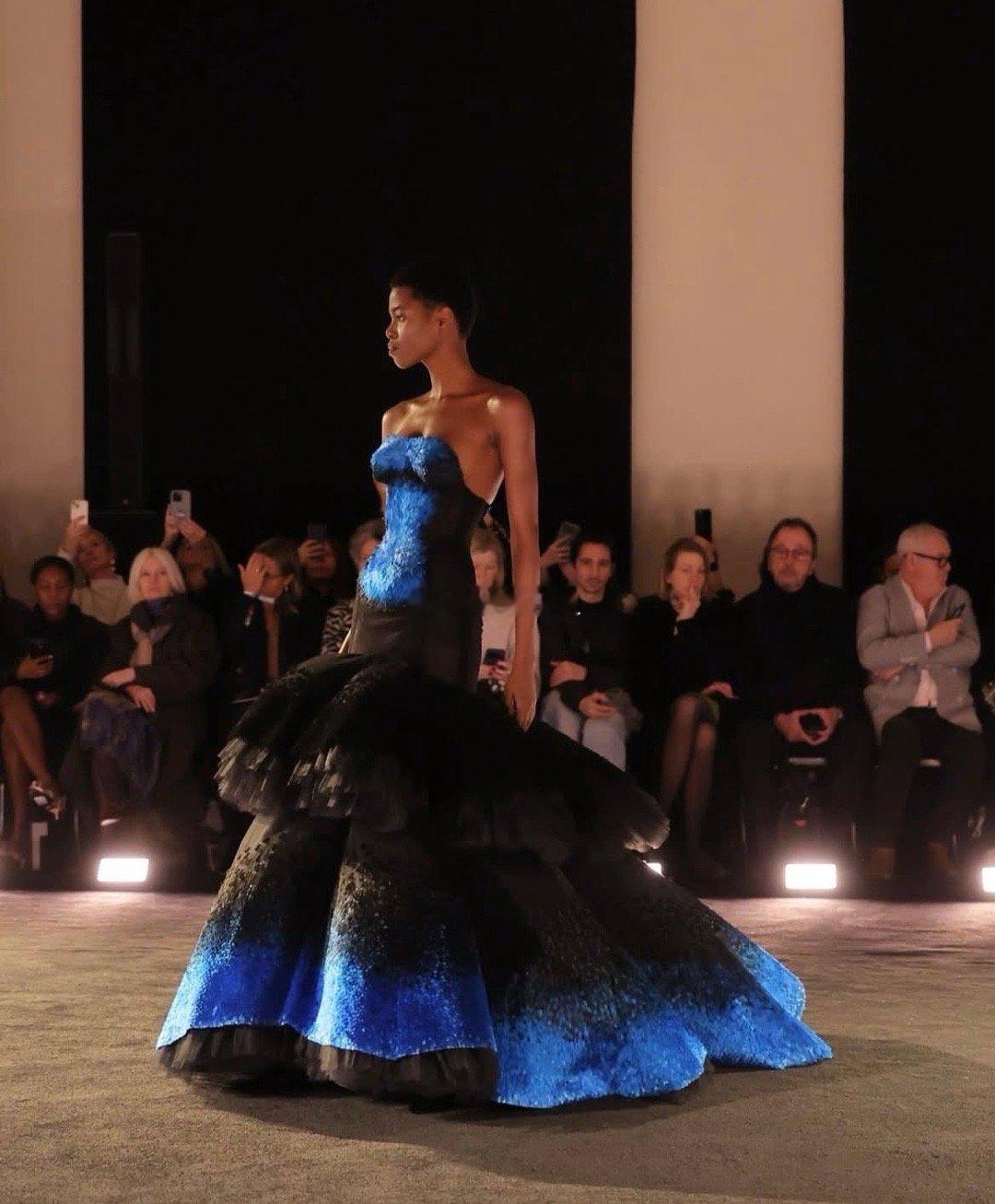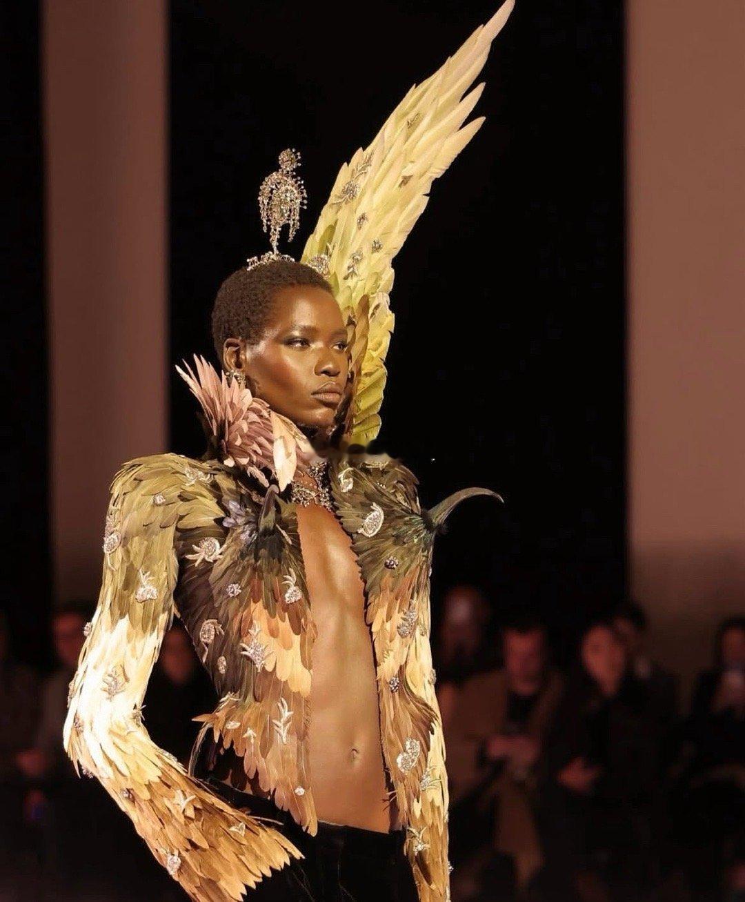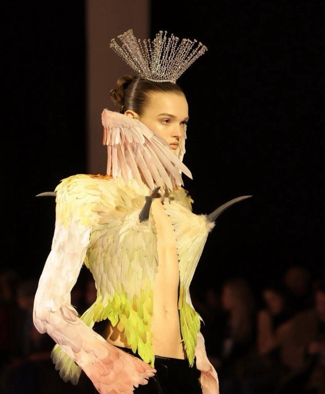 【Schiaparelli2026春夏高定|痛苦与狂喜】Daniel Roseberry 以“The Agony and The Ecstasy”打开了时代的情绪,蝎尾尖刺、振翅羽翼与河豚锋芒,生物防御本能被65,000根羽毛化作铠甲,顶级手工艺让危险之美震颤新生。一套礼服用27种蓝染出流动光影,材质堆叠如动物皮肤般呼吸,当愤怒凝为羽刺,狂喜渗入染缸,高定天花板再次被撕裂。巴黎时装周巴黎高定时装周