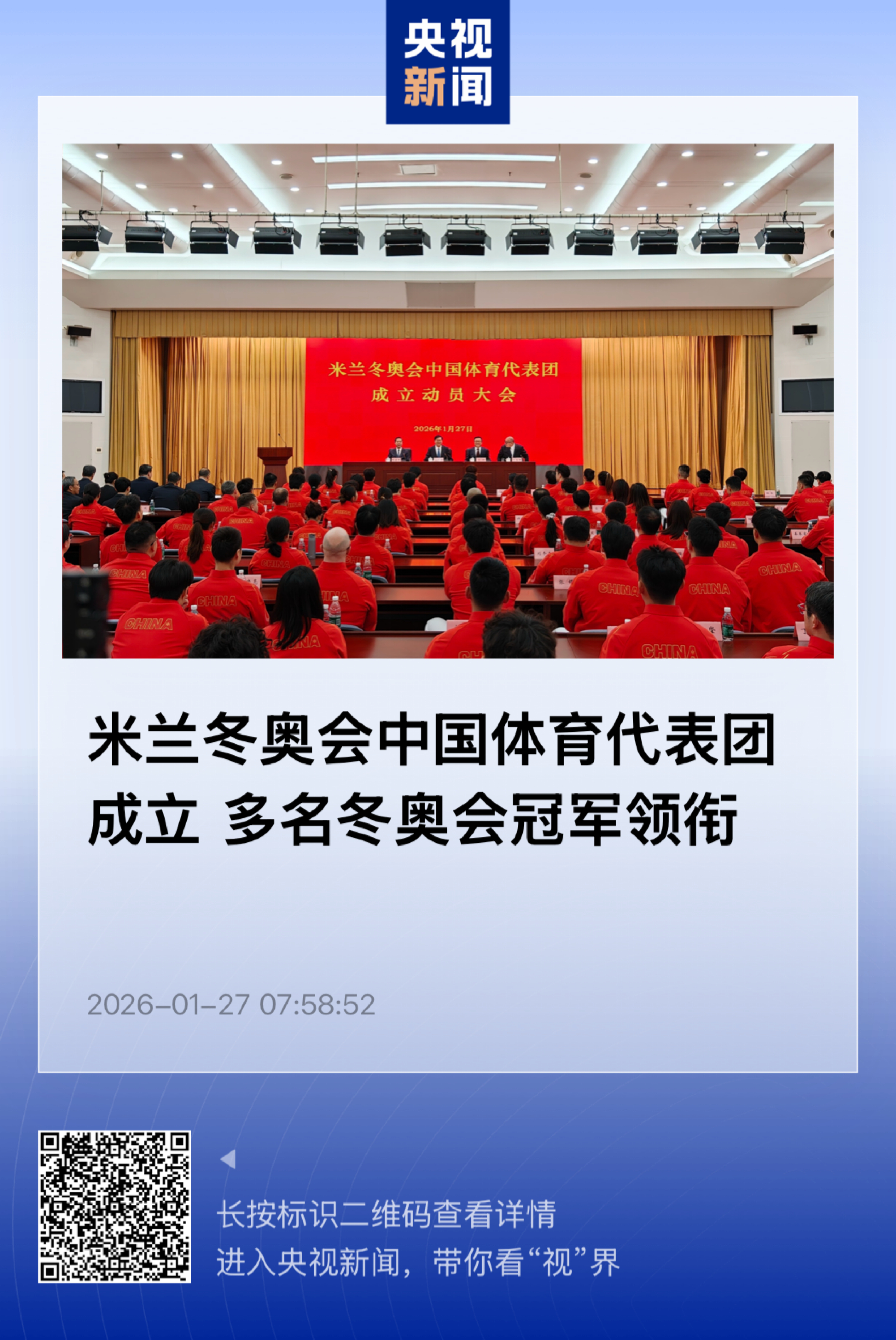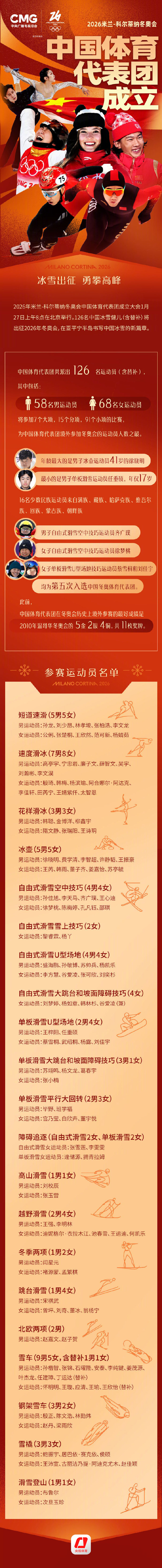 【米兰冬奥会中国体育代表团成立 多名冬奥会冠军领衔 126名运动员参赛】 (央视新闻 2026-01-27 07:58:52 ) 第25届冬季奥林匹克运动会中国体育代表团今天正式成立,共有126名运动员参赛,其中包括了徐梦桃、齐广璞、谷爱凌、苏翊鸣、隋文静、韩聪等冬奥会冠军。本届冬奥会将于2026年2月6日至22日在意大利米兰—科尔蒂纳进行,赛事共设16个分项和116个小项。 本届中国代表团共由286人组成,其中运动员126人(女子68人,男子58人),工作人员160人,将参加7个大项15个分项91个小项的比赛,是我国冬奥会境外参赛项目最多、运动员规模最大的一届。 参赛运动员平均年龄约25岁,年龄最大的41岁(冰壶 徐晓明),年龄最小的17岁(单板U型场地 任重硕),其中16名少数民族运动员来自满族、藏族、哈萨克族、维吾尔族、回族、蒙古族、朝鲜族。59人参加过冬奥会,9人获得过北京冬奥会冠军。67人为首次参加冬奥会。 参赛队工作人员共有128人,包括领队、副领队23人,教练员58人,管理、翻译11人,医务康复、器材保障、科研等辅助工作人员36人,其中外籍工作人员32人,分别来自美国、芬兰、荷兰、加拿大等21个国家。 网页链接
