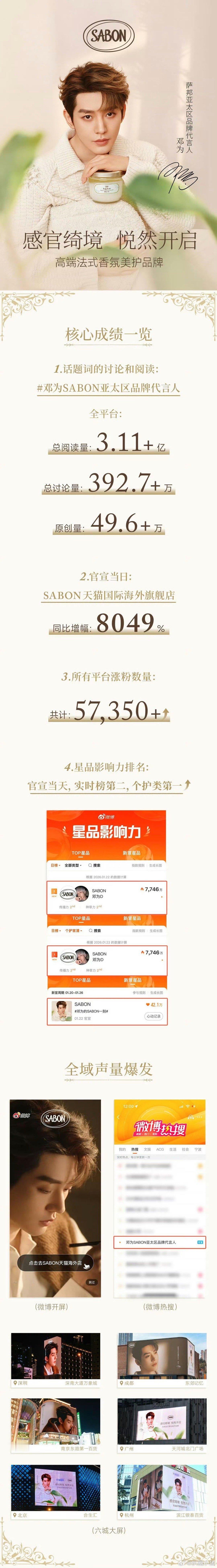 邓为官宣SABON官方战报:官宣24小时SABON同比增幅8049%!还得是邓为