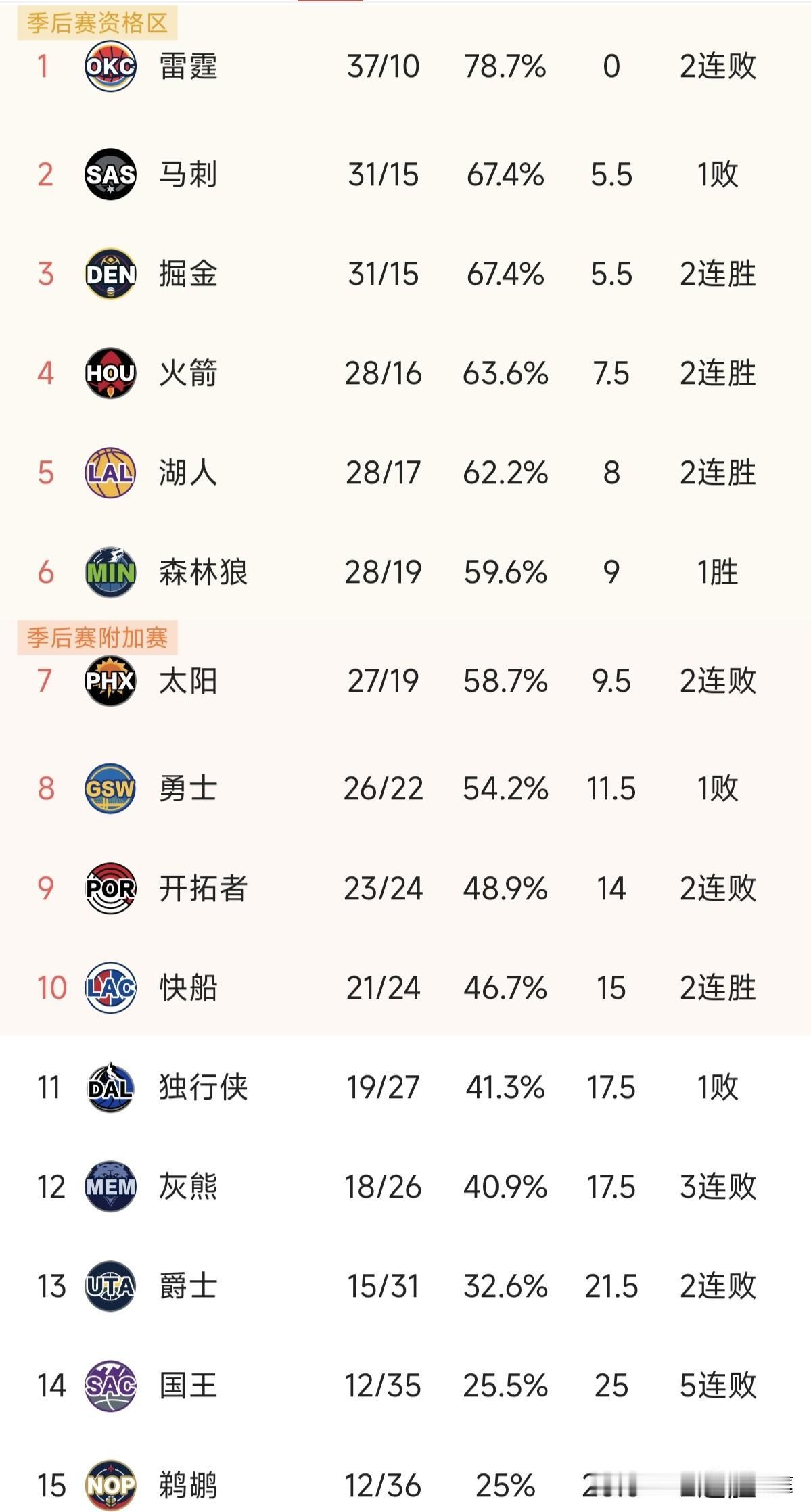 快船现在是真的上岸了!灰熊今天输给火箭后一波三连败排名在独行侠后面去了,目前快船领先2.5个胜场。 开拓者输球了,听哥的劝,西部前十你们现在把握不住,还不如把机会给杨瀚森和其他新秀赚一波好感和票房。 就是湖人和勇士这种有球星,有底蕴的球队对季后赛席位都不能掉以轻心,总共八个名额,开拓者凭啥呢?
