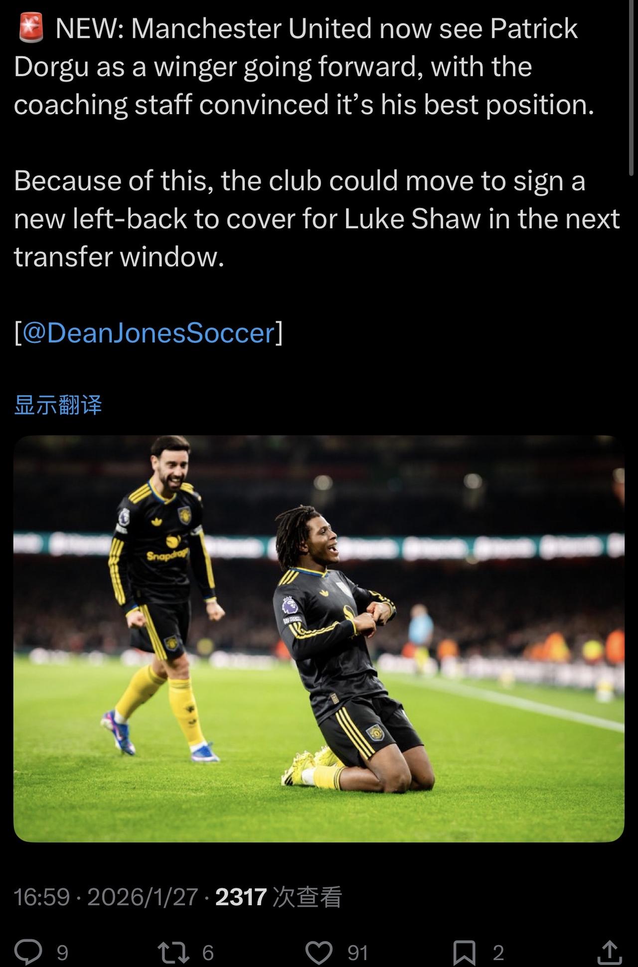 还记得1周前,有媒体报道说:曼联要买左边锋吗? 这周变成买左后卫了[捂脸] 曼联需要再买左后卫吗?外面出租了俩,达洛特,利马,马兹拉维又能客串。 ……………………………………………………………… 曼联现在将帕特里克·多尔古视为一名边锋,教练组确信这是他的最佳位置。 因此,俱乐部可能会在下一个转会窗口签下一名新的左后卫来顶替卢克·肖的位置。