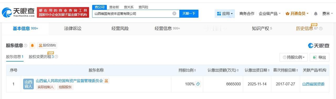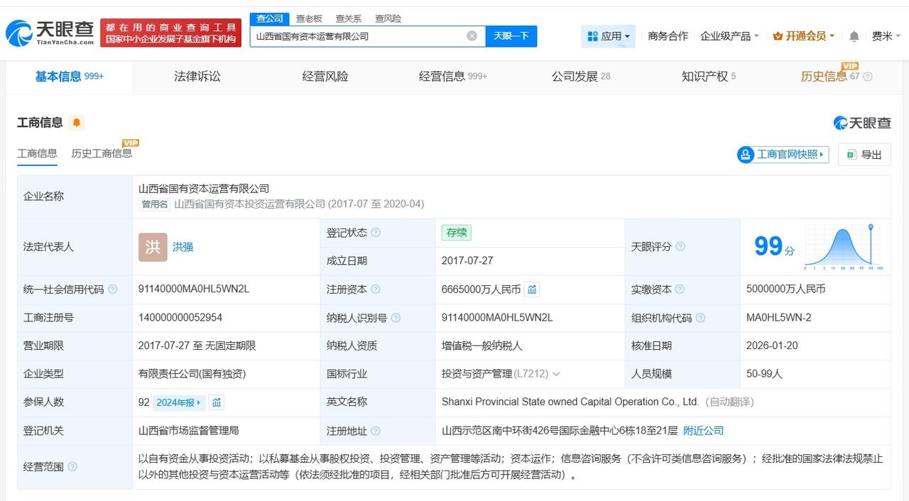 山西省国有资本运营公司增资至666.5亿增幅33.3% 天眼查App显示,近日,山西省国有资本运营有限公司发生工商变更,注册资本由500亿人民币增至666.5亿人民币,增幅33.3%。 该公司成立于2017年7月,法定代表人为洪强,经营范围包括以自有资金从事投资活动、资本运作、信息咨询服务等,由山西省人民政府国有资产监督管理委员会全资持股。 天眼查信息: