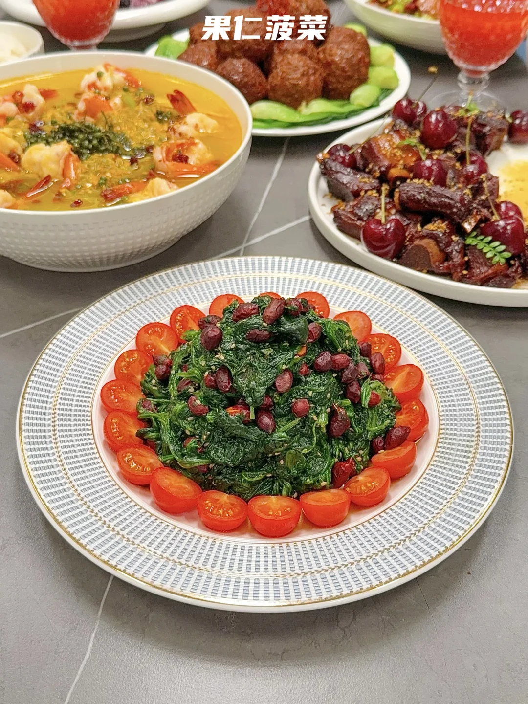 🥬【果仁菠菜】不用自己调汁,直接上家乐凉拌汁,椒麻味足却不腻口,拌上菠菜和炸香的果仁,清爽中带着脆香,解腻又开胃,绝对是年夜饭桌上一抹亮色。