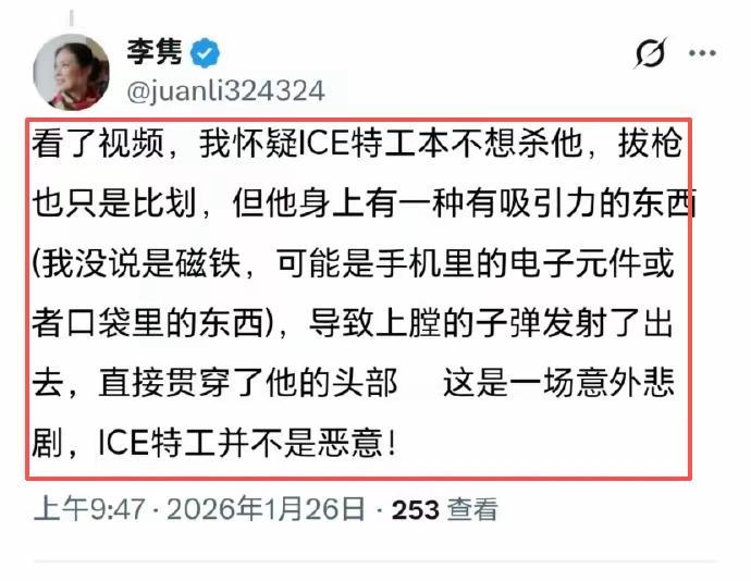 看马保国打五连鞭我没笑,但“磁吸太后”这番言论我实在忍不住啊!这么反智的辩解理由都能说出口,该不会是强化剂或者叶子服用过量致幻了吧! 看样子,“磁吸太后”说不定还会为ICE特工吆喝,让死者家属给ICE赔偿受惊精神损失费呢! 也不知道是哪培养出来的人才,可以考虑开除族谱了!