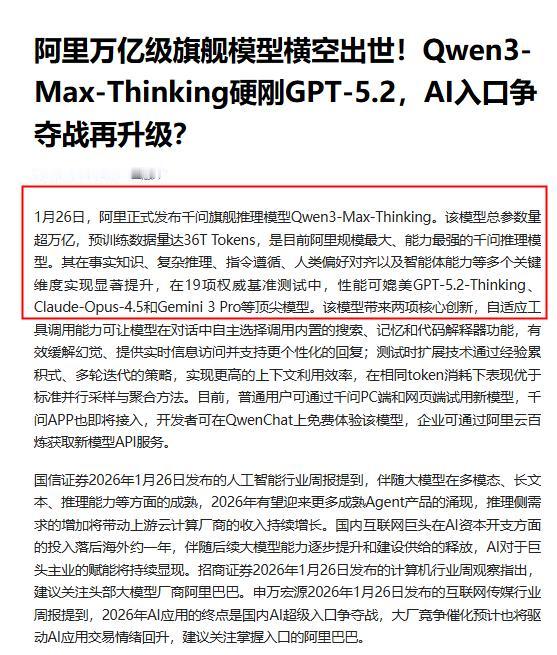 中美竞争形势大变,阿里传出一则消息,资本市场怕是要重新审视中国AI了! 近日,阿里正式发布千问旗舰推理模型Qwen3-Max-Thinking,性能媲美GPT-5.2、Gemini030pro,甚至在多项关键性能基准测试中表现还超过了这些国际顶尖模型,成为迄今为止最接近国际顶尖模型的国内最强AI大模型。 据了解,Qwen3-Max-Thinking刷新了多项全球记录,能够大幅增强自主调用工具的原生Agent能力,让模型实现像专业人士那样边用工具边思考。 回答速度更快,准确率也更高,模型幻觉更是大幅降低。 事实上,Qwen3-Max-Thinking的发布,远不是刷新一次记录那么简单,更关键的是其背后的意义。 咱们都知道,目前中美AI竞争的态势早已经从单点竞争变为了全栈竞争,单一模型的领先并不是那么重要。 而阿里千问Qwen3-Max-Thinking的成功,背后恰恰是一条从模型、云计算到芯片的完整全栈技术能力加持的结果。 为什么阿里能够搞出这么牛的大模型,就是因为阿里具备全栈能力,算力有阿里云、芯片有平头哥,而在模型上,现在的阿里千问是全球开源模型超400,衍生模型数量超20万的世界第一大开源模型。 光从这一点来说,资本对于阿里的价值、中国AI的价值就得重新考量,因为对于资本市场而言,他们更看重长期的效益。 而具有全栈能力,并且坚定开源生态的阿里,未来必然会持续扩大模型规模,源源不断的突破模型能力上限,中国企业的模型能力底线也会不断提高。 这对于资本市场而言,绝对是不可放弃的,未来怕是会有更多的资本将目光从硅谷挪开,转而投向AI技术高速发展的中国!