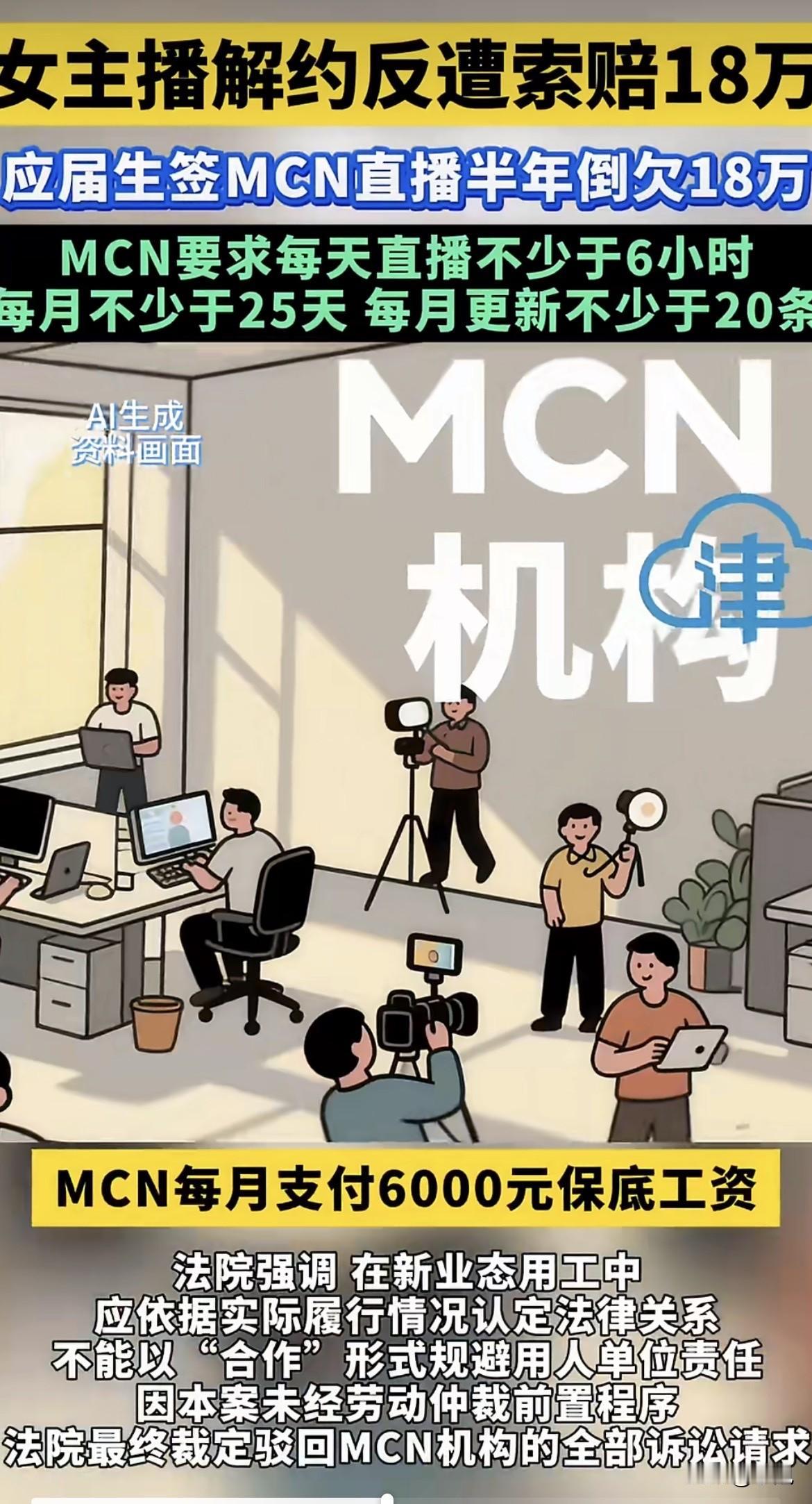 一个刚毕业的女孩,干了半年直播,没攒下钱,最后等来的是一张18万的索赔单。 2024年6月,应届生崔某熙和南京一家叫七某传媒的MCN公司签了合同。合同名字叫“艺人合作协议”,听起来是平等合作。公司答应每月给她6000元保底,前提是她每天至少播6小时,每月播满25天,还得更新20条短视频。公司管吃管住。 她照做了。从夏天播到冬天,每天雷打不动六小时。后台数据记得清楚:六月赚了2400,七月4200,八月6186,九月6904,十月5526,十一月3656。大部分月份没达到6000保底,公司给她补了差额。半年里,她从平台直接拿到手的总收入大概两万九。 干了半年,她觉得这行也许不适合自己。2024年11月,她提出了解约。 公司的反应不是挽留,而是一纸诉状。要求她退还所有保底工资、住宿餐饮费,再加上一笔违约金,合计18万余元。算下来,她半年总收入还不够赔的。 这事到了法院,法官没只看合同上写的“合作”两个字。法官看到的是,她每天干什么、干多久、什么时候休息,全得按公司的规定来。她赚的钱,一大半得靠公司补足才能达到保底。法院认为,这符合劳动关系的实质,不能披着“合作”的皮,来规避用人单位的责任。 但这18万的债,她最终没背上。法院把公司的起诉全驳回了。关键理由是:公司把这当成普通合同纠纷来告,但法院认为这事的核心是劳动纠纷。而法律规定,劳动纠纷必须先去申请劳动仲裁,不能直接上法院。程序,走错了。 一场官司因为程序问题暂告段落。可这件事里藏着的门道,很多年轻人第一次签合同时根本看不清。有数据显示,这个行业里,近七成职业主播月收入其实不到3000元。一份“合作”合同,可能埋着直播时长、自动续约、天价违约金的陷阱。口头承诺的“保底高薪”和“全力扶持”,落到纸上可能完全是另一样。 崔某熙是幸运的,法院看到了表面合同下的实质。但这个行业里,还有更多被“网红梦”和“保底薪资”吸引的年轻人。他们面对的可能不是梦想孵化器,而是精心计算的违约金陷阱。 你看过那种“无经验、高保底”的主播招聘广告吗?你觉得这种“合作协议”到底是机会,还是坑?