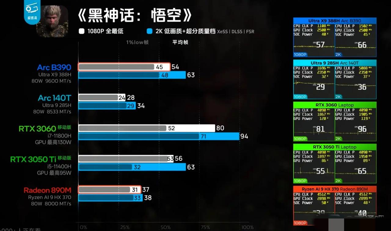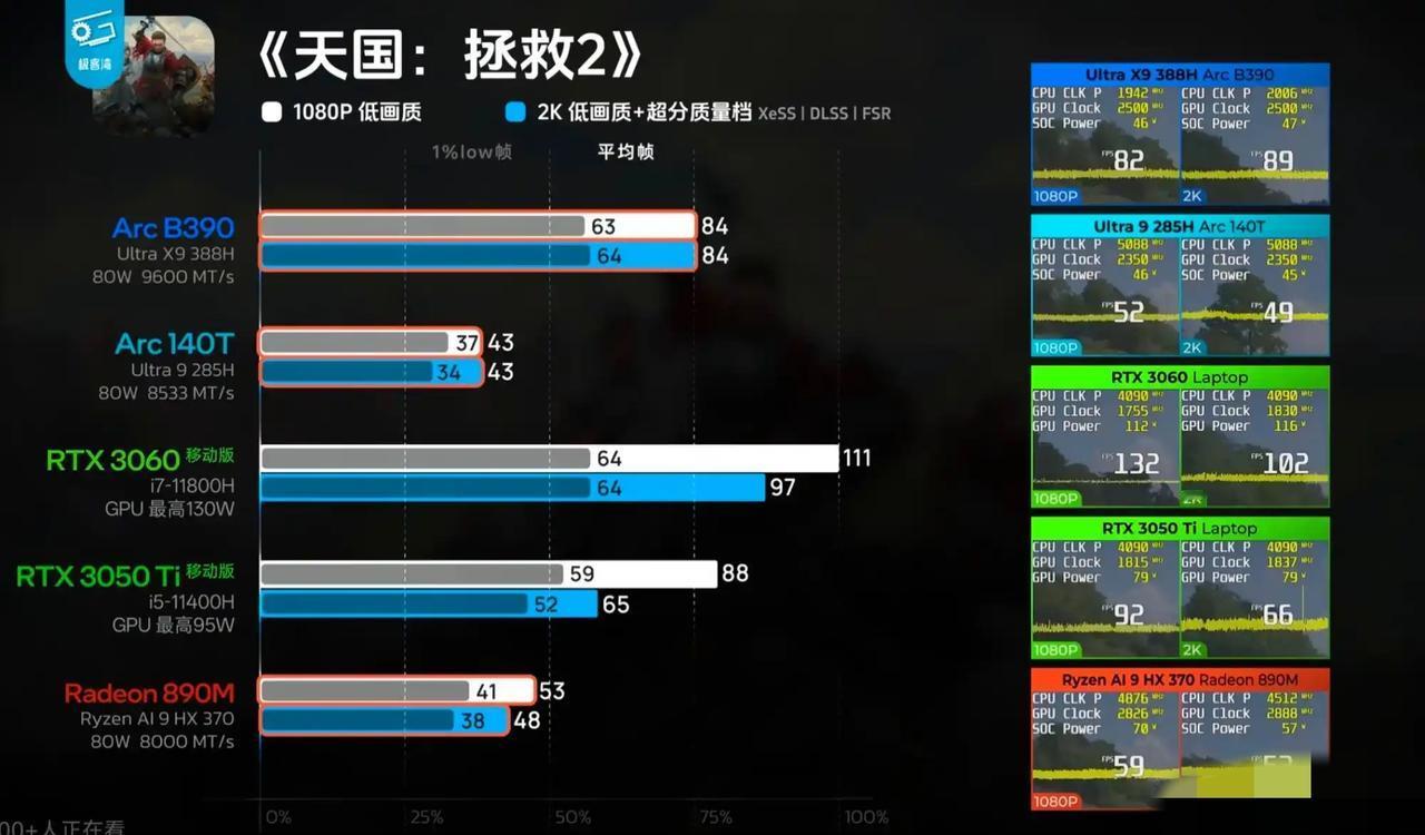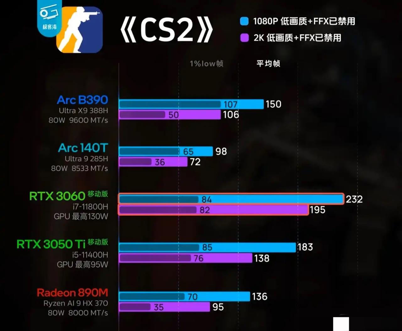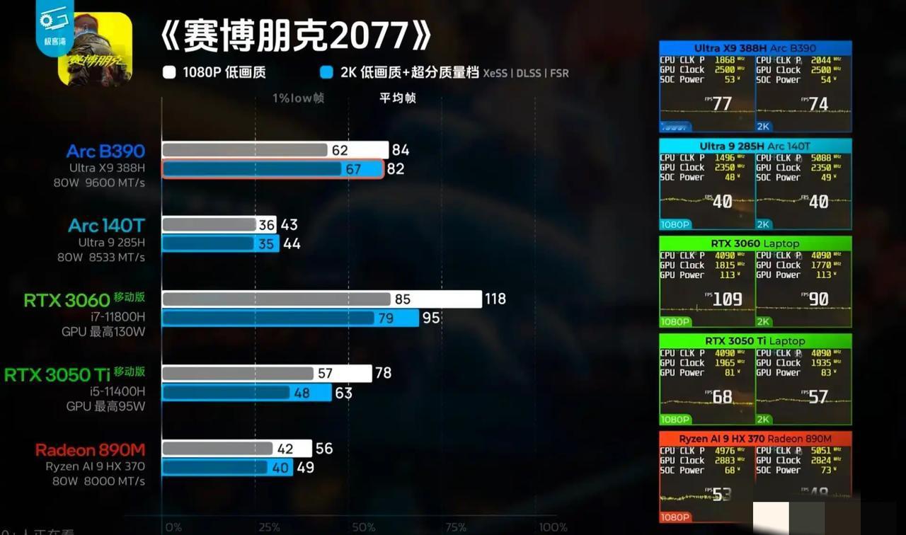 极容湾测试来了,b390核显大致和3050Ti相当。 CS2 低画质帧数居然打不过11400h+3050Ti,看来ptl如果搭配独显,cpu瓶颈还是会很严重。 主流3a基本和3050Ti互有胜负,和3060/4050差20%以上,更别提8060S了。 更大的看点还是在掌机上?核显低功耗能效确实很强。续航平平无奇,每瓦续航离m4/5差了挺多。