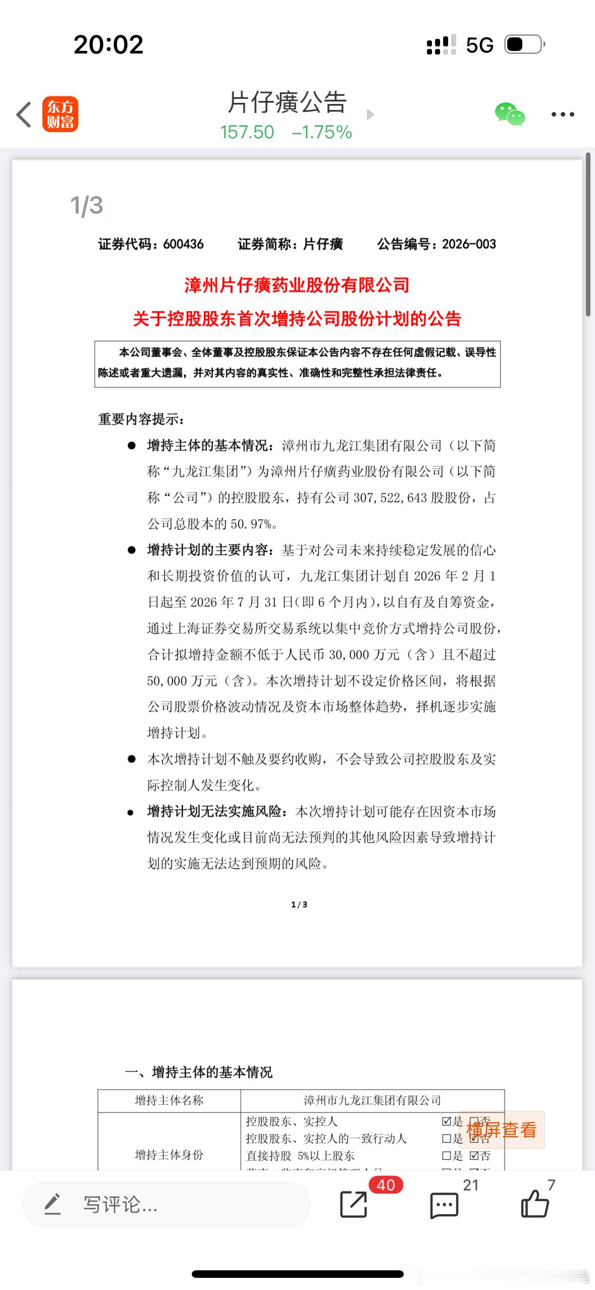 片仔癀控股股东九龙江集团拟以3亿元至5亿元增持公司股份。这价格还不增持,就是国有资产流失,在位的都应该要追责。480减持的30亿集团可以分十次增持出公告。不信你150能还能跌穿。原来大资金打压股价是为了增持,好样的这坑挖的真漂亮。