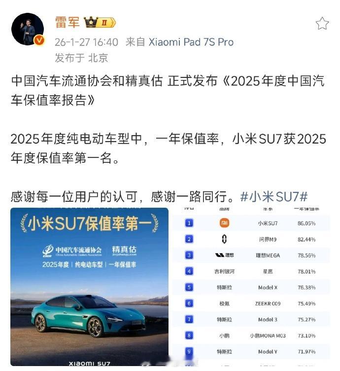 雷军回应小米SU7保值率第一名雷军:小米SU7保值率第一