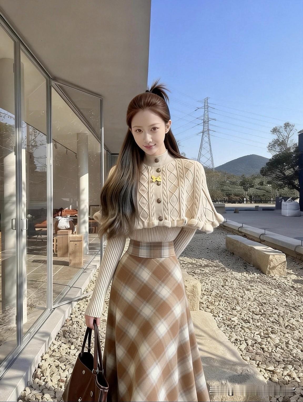冬日的美德拉 玻璃窗前, 碎石小径托起影子。 菱格斗篷裹住暖意 格纹长裙垂成心事。 山在远处沉默, 风在发梢停泊, 棕色皮包里, 装着未说出口的诗。 回眸时, 阳光正落在肩头, 把温柔, 织进每一寸针织。 #把糖炒栗子穿上身#今天这么穿 #怎么穿都不腻#