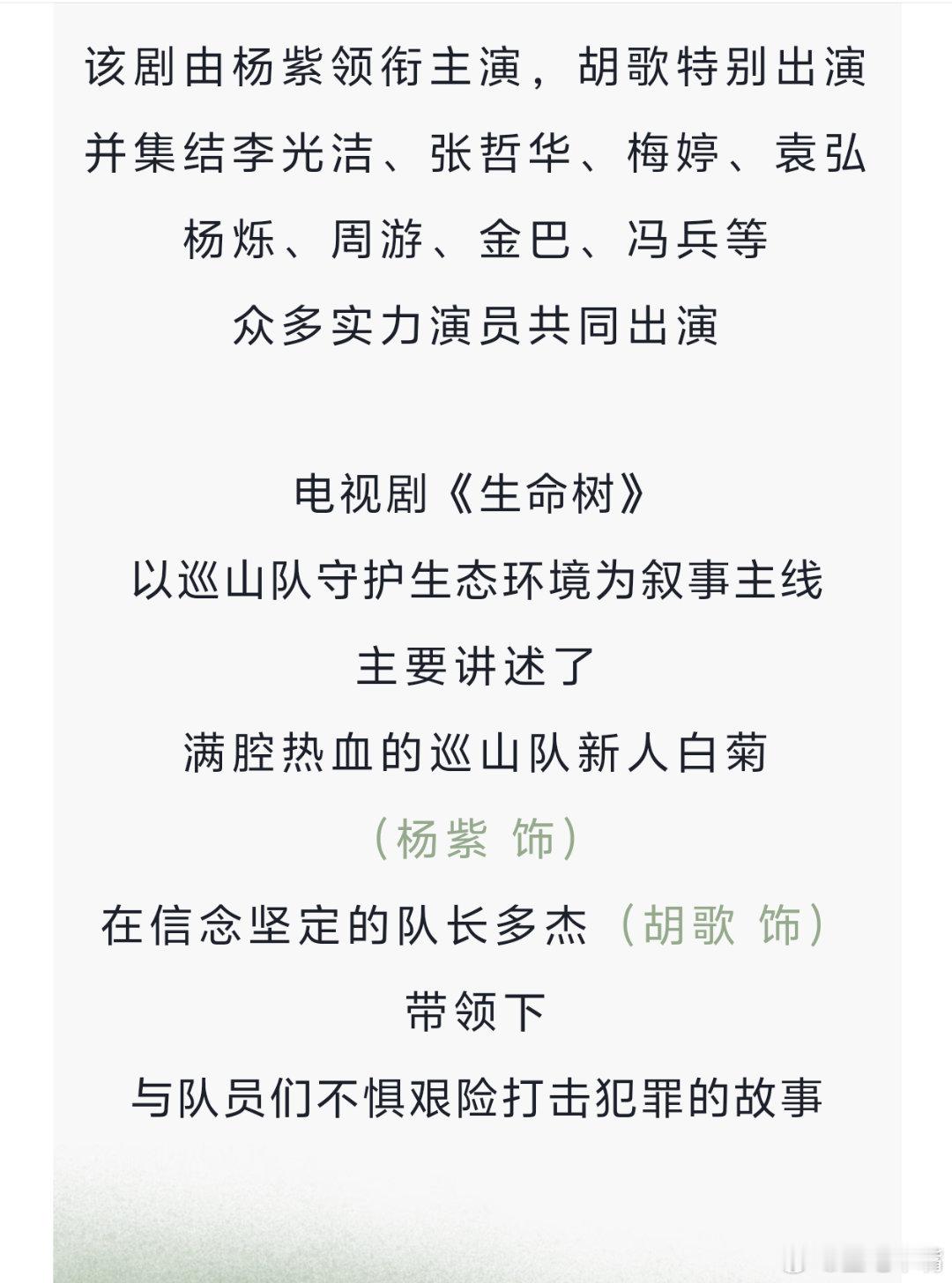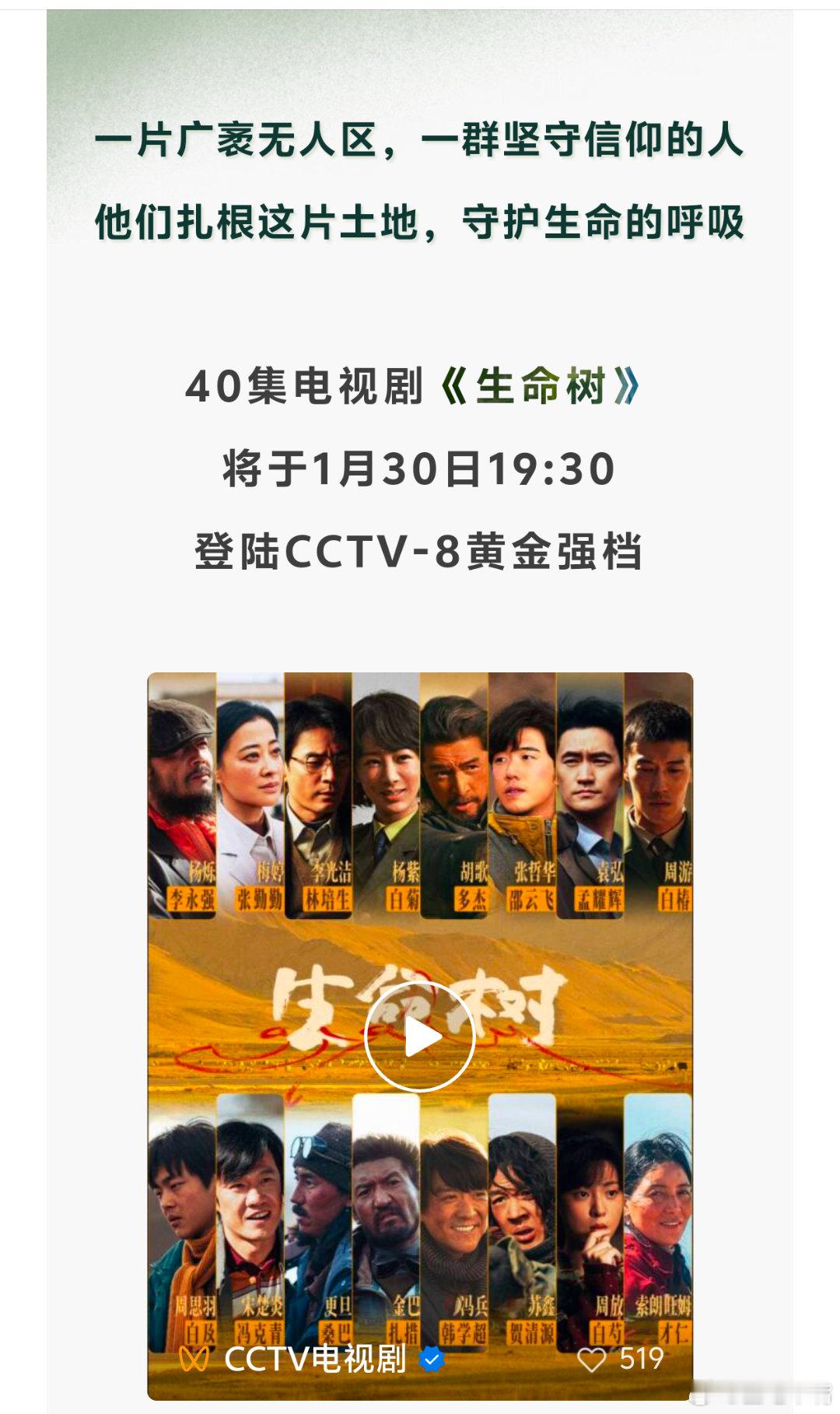 生命树全阵容剧照还没开播就被杨紫眼技震撼 CCTV电视剧公众号发文:一片广袤无人区,一群坚守信仰的人他们扎根这片土地,守护生命的呼吸!无人区里,淌着坚守的热血也藏着不朽的赤诚!敬请期待1月30日杨紫、胡歌《生命树》!