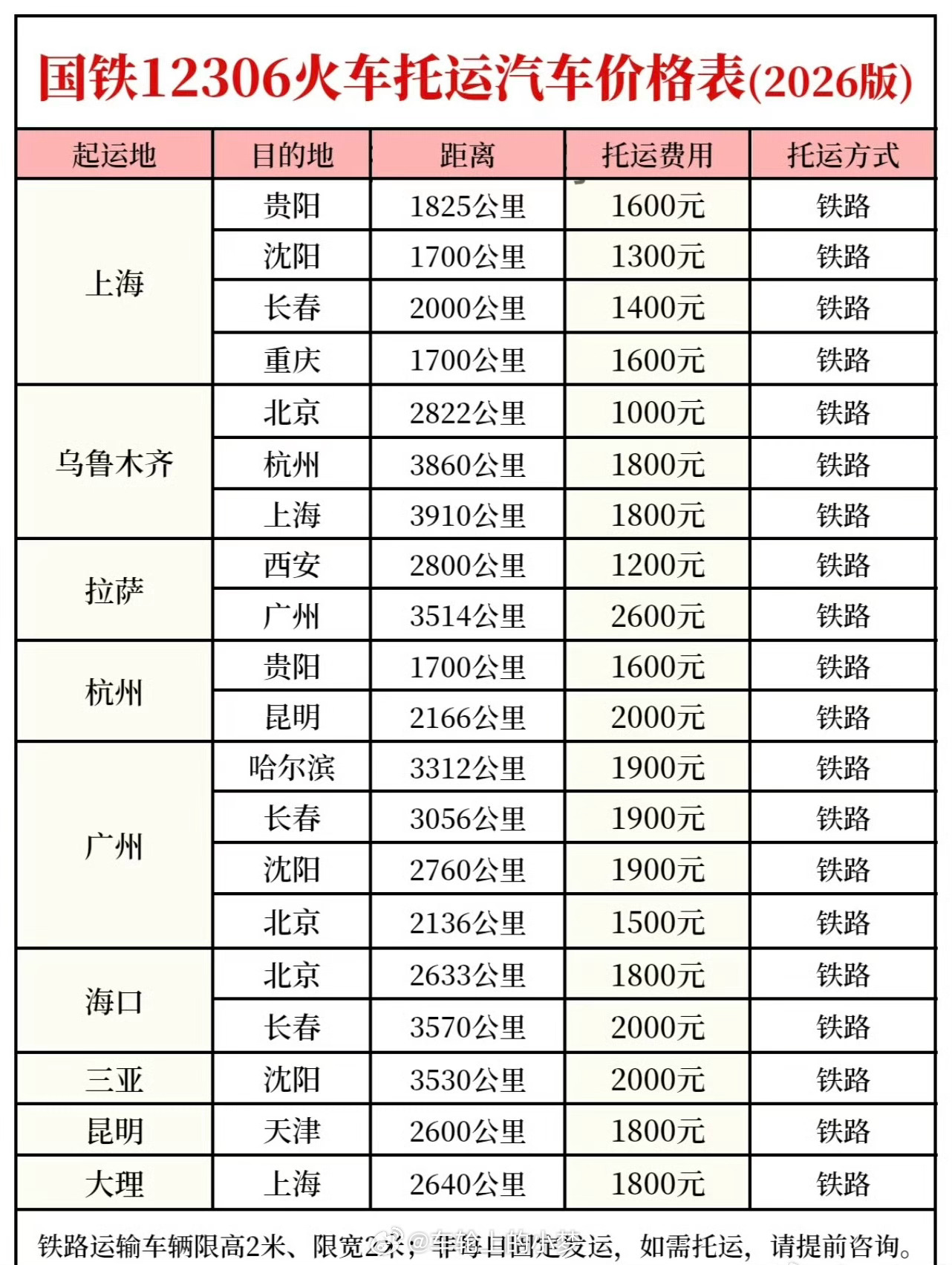 12306托运汽车订单火爆 小梦又涨见识了啊!火车竟然能托运汽车!价格流程在下图,有需要的瞅两眼得了嗷~