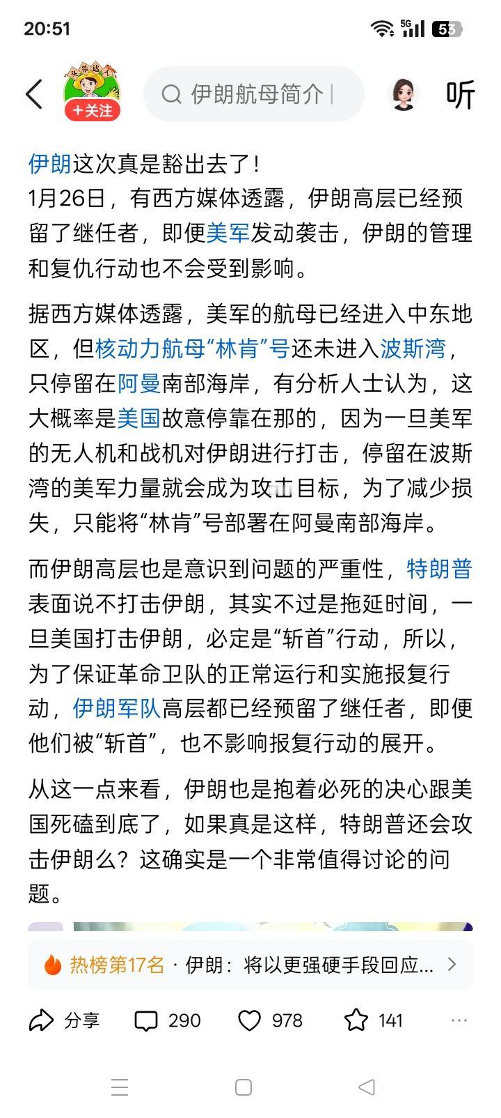 继任者都有了? 网络上有来自西方媒体的消息,称伊朗为了应对美国的空中袭击,特别是对高层领导人的精准空中打击,已经预设了继任者,防止突然出现群龙无首,一盘散沙,各自为战的状态。 但是,除了有哈梅内伊进入德黑兰的一个地下堡垒,他在地面上的工作由他的三儿子马苏德全面代替和负责的传闻外,其它高级官员的未来继任者,并无任何消息透露。 这是否说明,伊朗目前高层中的状态好像十分敏感和微妙,很多事情很可能是处于不确定之中。