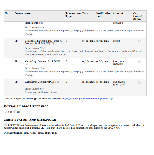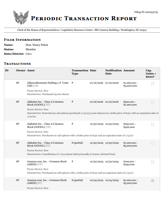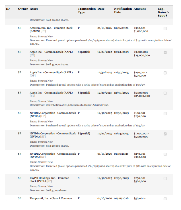 南希・佩洛西最新申报约 6900 万美元股票交易,其中卖出 5000 万美元苹果(AAPL)股票。主要卖出标的包括:卖出 5000 万美元苹果(AAPL)股票卖出 500 万美元英伟达(NVDA)股票卖出 500 万美元迪士尼(DIS)股票其同时买入新的认购期权:买入 50 万美元谷歌(GOOGL)长期认购期权买入 50 万美元亚马逊(AMZN)长期认购期权买入 50 万美元苹果(AAPL)长期认购期权买入 25 万美元英伟达(NVDA)长期认购期权申报人:Hon. Nancy Pelosi(美国国会众议院议员,代表加州第 11 选区)申报主体:表格中 “SP” 标注的交易,实际由其丈夫保罗・佩洛西(Paul Pelosi)操作,这是佩洛西家族交易的典型特征核心规则:美股议员申报仅披露交易金额区间(而非精确数字),并需标注是否产生超过 200 美元的资本利得~~~~~~~~~~~~~~佩罗西确实牛逼,希望天底下所有的官员都能公开他们的交易