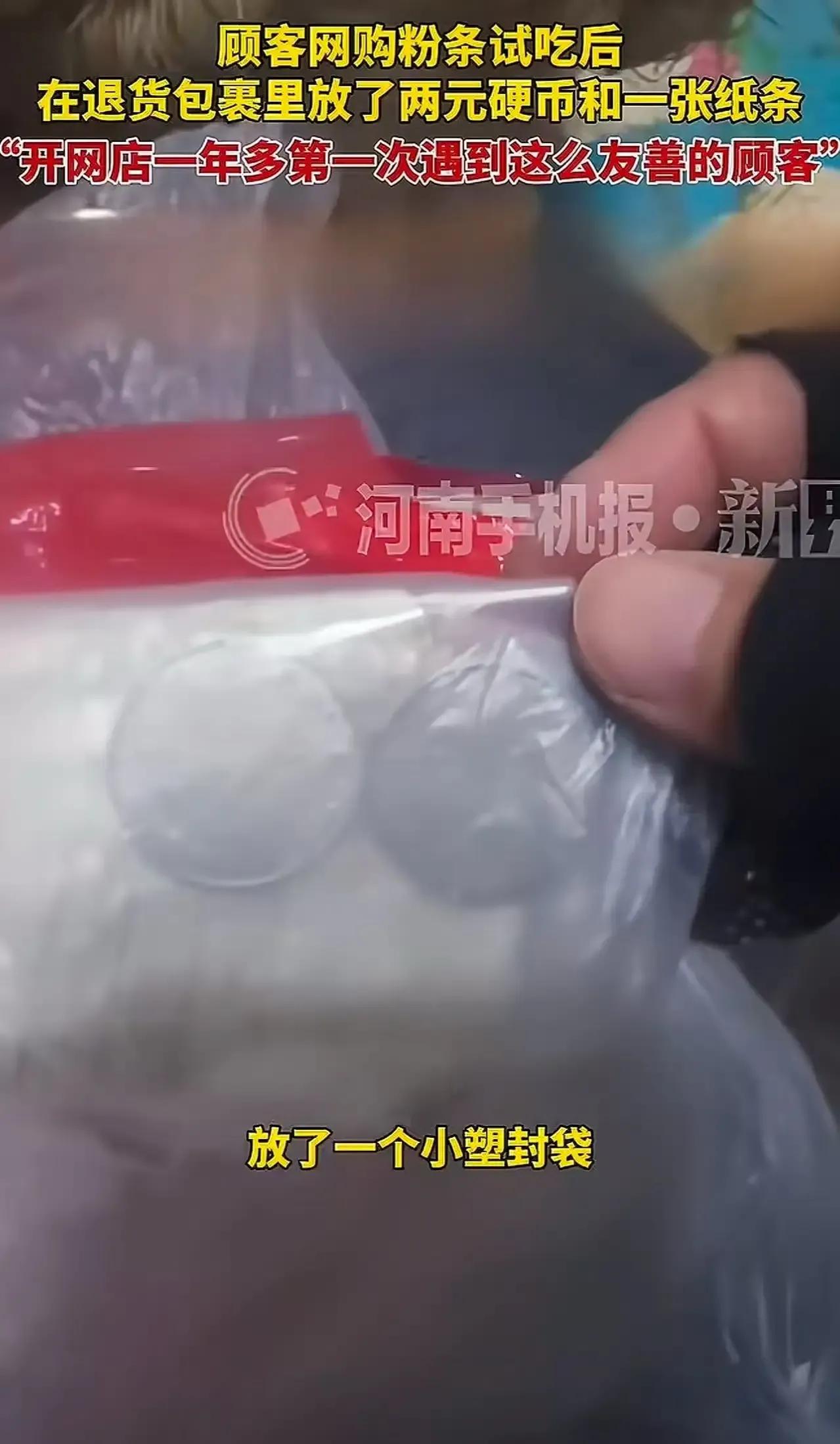 网购退货见多了,但你见过退货还补钱的顾客吗?安徽阜阳的一位网店老板就遇到了这么一件暖心事,让人不禁感叹:这退货界的一股清流,究竟是怎么回事呢? 这位网店老板在网上卖粉条,平时也遇到过各种退货情况,但这次却让他大吃一惊。当他收到顾客的退货包裹,打开一看,里面竟然掉出一个透明小塑封袋,里面装着两枚一元硬币和一张手写的便签纸。他疑惑地展开纸条,只见上面工整地写着:“试吃了一点粉条,补2元。谢谢!”原来,这位顾客在收到粉条后,试吃了一点觉得不满意,于是选择了退货。但她并没有像其他人那样直接退货了事,而是特意补上了试吃的两元钱,并附上了感谢的话语。这种诚信和友善的行为,让网店老板感动不已,他表示:“开这么久的网店,第一次遇到这么友善的人!” 这小小的两元钱,不仅体现了顾客的诚信与友善,更让我们看到了人与人之间的温暖与信任。在这个网购盛行的时代,这样的正能量故事值得我们点赞和分享。大家快来评论区说说,你遇到过这样的暖心退货吗?退货衣服 网购退货骗局