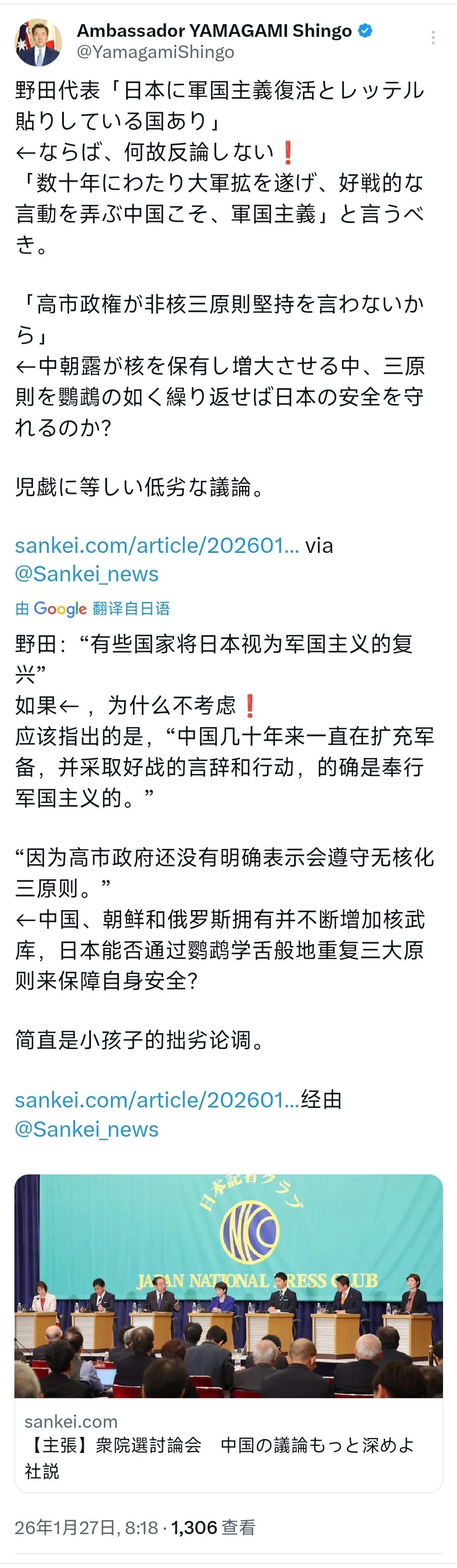日本驻澳大利亚大使山上信吾今天(1月27日)叫嚣:“野田佳彦代表:有些国家给日本贴上军国主义复活的标签,为什么不予反驳。几十年来进行大规模军备扩张、玩弄好战言行的中国,才是军国主义。因为高市早苗政府没有说坚持无核三原则。在中俄朝拥有并扩大核武器的情况下,像鹦鹉一样重复三原则就能保护日本的安全吗?近乎儿戏的低劣议论。” 日本是二战战败国,山上信吾应该了解一下《联合国宪章》中有关敌国条款之规定:如果战败国有危及他国安全的行为,常任理事国有权对其发动军事打击,无需得到联合国安理会授权。山上信吾还在愚弄日本国民众,声称敌国条款已经过期,缺乏基本的法律常识,敌国条款至今未曾修改,何来过期之说?中方一再表示,绝不允许日本复活军国主义,这是《联合国宪章》赋予中国的权力。