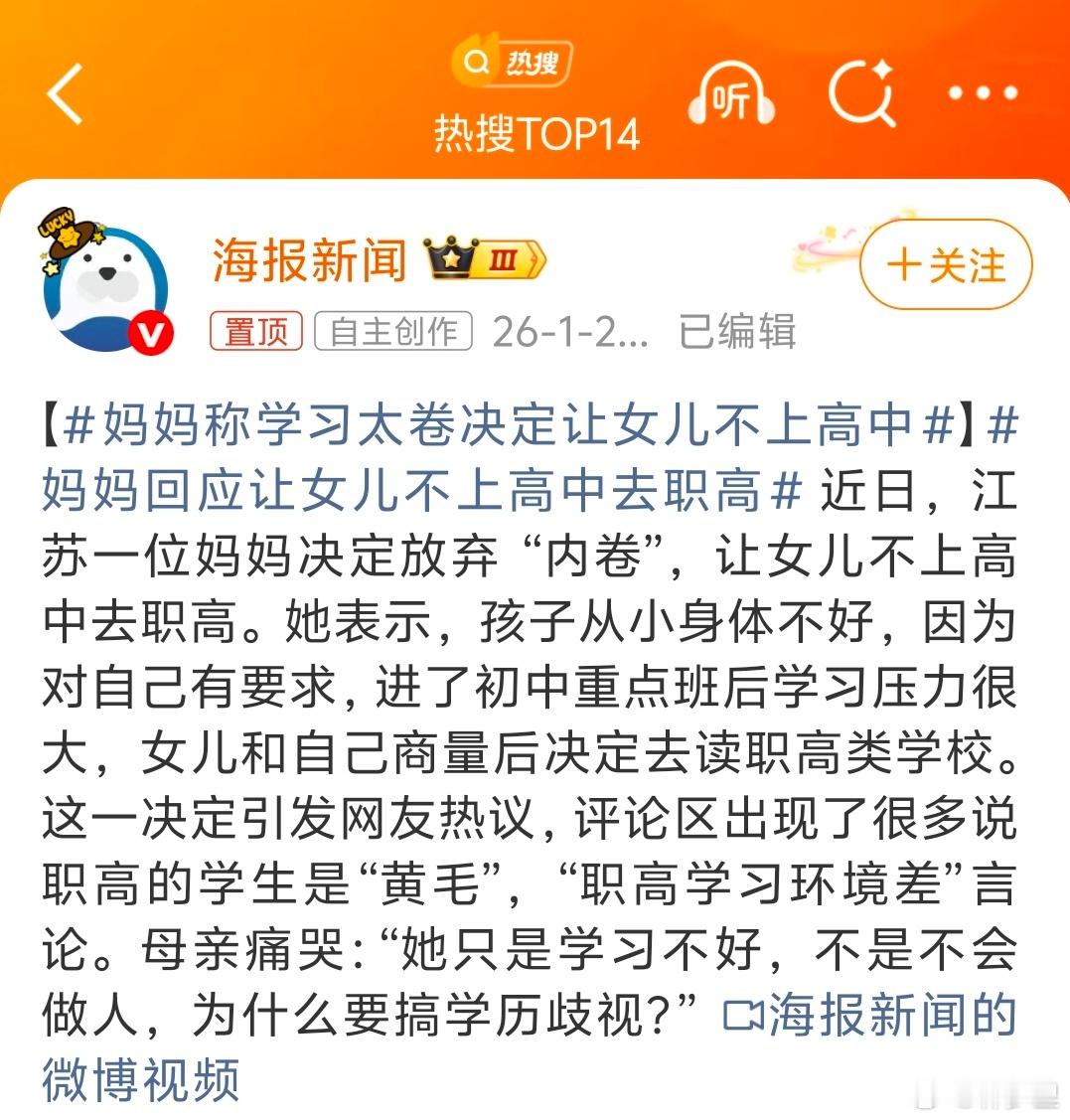 妈妈称学习太卷决定让女儿不上高中“从小身体不好”“学校的各种病毒,她一个都没有逃掉过”恕直言,职高里不做好防护,一样感冒发烧,身体不好。