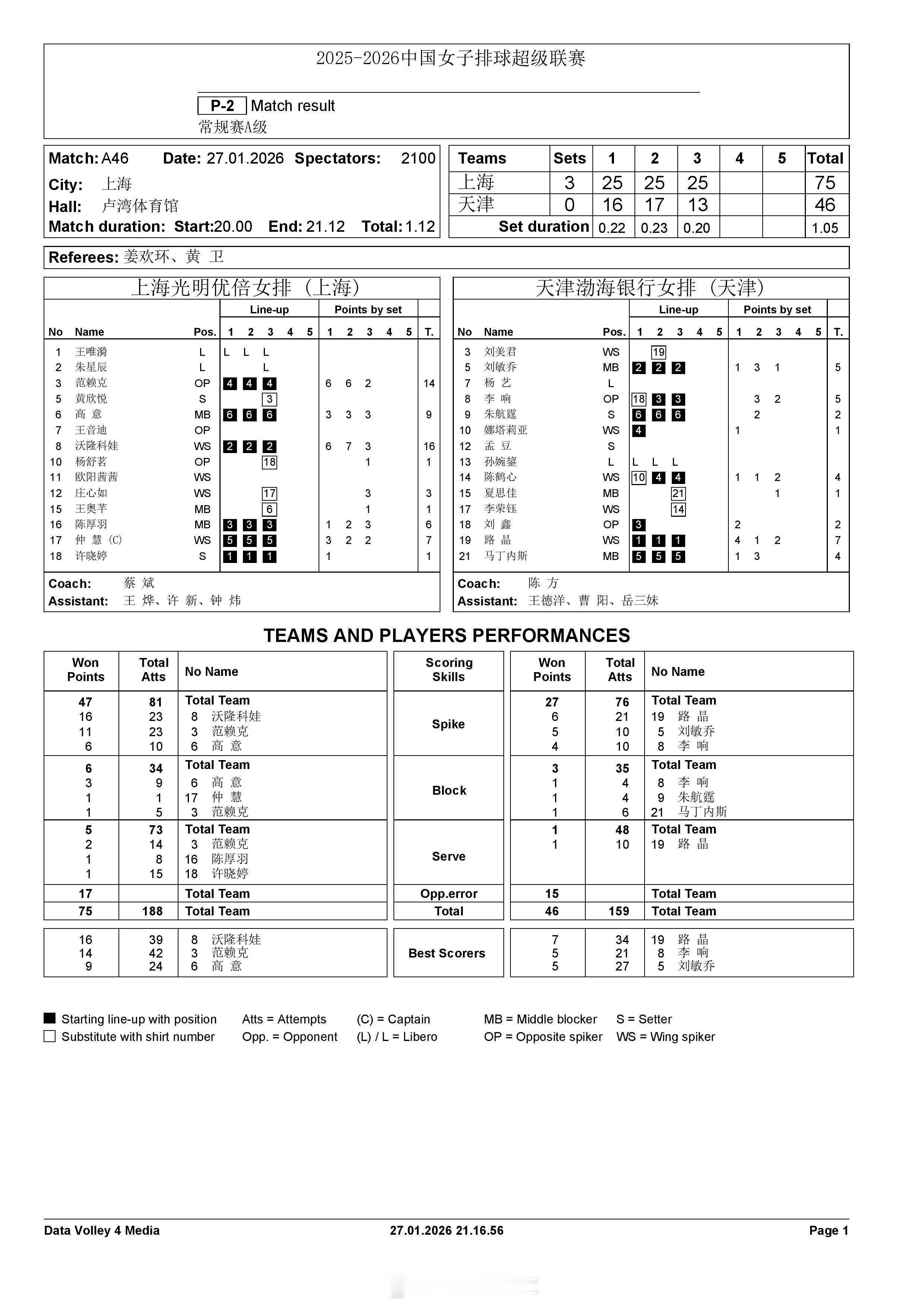 【中国女排超级联赛 上海3-0天津】27日晚,A级常规赛第12轮,上海光明优倍在主场以3-0(25-16, 25-17, 25-13)横扫天津渤海银行。沃伦科娃16分,范赖克14分,高意9分,仲慧7分,陈厚羽6分;路晶7分,刘敏乔、李响各5分。