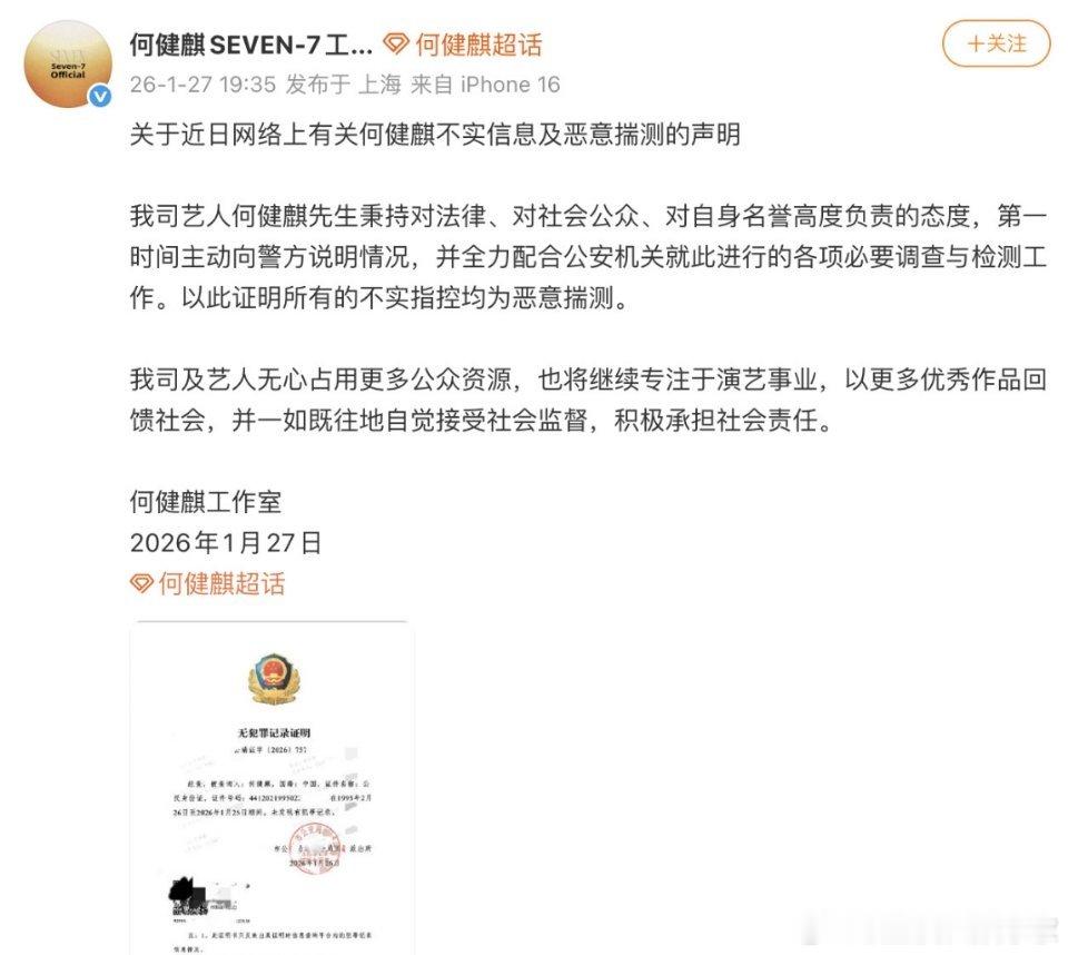 何健麒工作室之前也发声明维.权了,网络不是法外之地,没有实锤的谣言对艺人的事业和生活都是毁.灭.性.打.击。法律层面的追责,是对恶意造谣者最有力的震慑,也能让大家更谨慎地对待网上的信息。目前双方态度都很强硬,还得让子~弹飞一会儿,实在不行就让警.方出通.报吧,反正俩人得进去一个!何健麒公开无犯罪记录证明