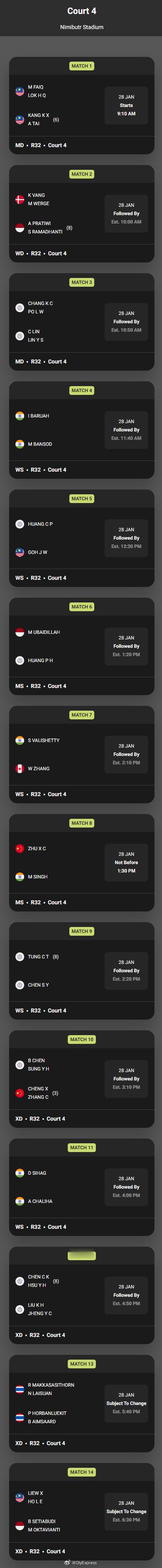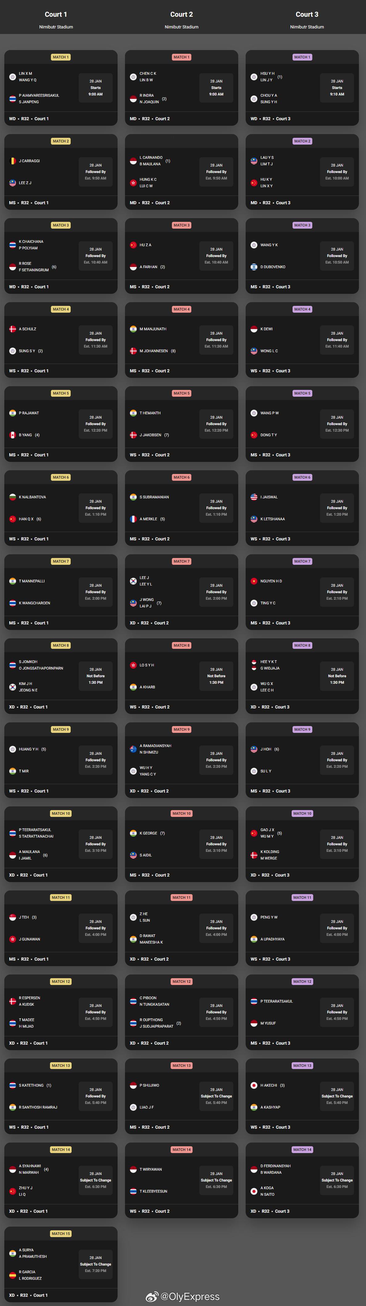 【泰国羽毛球大师赛28日赛程对阵】2026年泰国羽毛球大师赛羽联超级赛 1月28日曼谷,世界羽联超级300泰国大师赛将进入第二比赛日,比赛将于北京时间10时开始,国羽赛程对阵如下,完全赛程对阵见图:男单:胡哲安vs法汉(印尼)董天尧vs王柏崴(中国台北)朱轩辰vsM-辛格(印度)女单:韩千禧vs纳尔班托娃(保加利亚)男双:胡珂源/林祥毅vs刘奕胜/林志健(马来西亚)混双:高家炫/吴梦莹vs科尔丁/沃尔吉(丹麦)朱一珺/李茜vs萨赫纳维/马瓦赫(印尼)程星/张驰vs陈柏元/宋奕萱(中国台北)