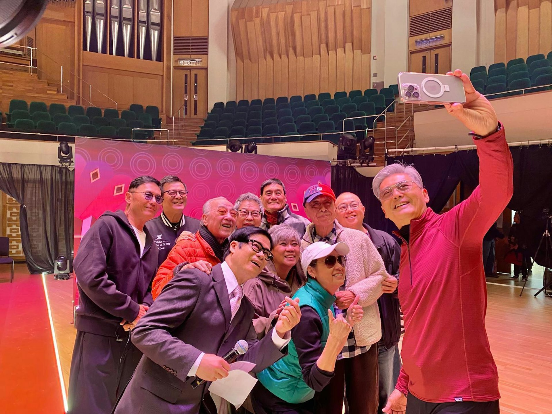 一代笑匠、现年84岁的卢海鹏(鹏哥)演而优则唱,今日(27日)在尖沙咀文化中举行《卢海鹏鸣金收咪演唱会》。一众圈好友,包括有黄日华、吴丽珠、苗侨伟、戚美珍、叶振棠等人现身捧场支持,就连周润发(发哥)都前来探班,更送上一封大利市给卢海鹏,预祝演唱会成功。身为今晚主角的卢海鹏精神爽利,在傍晚时与一众好友在后台拜神,大家齐聚一堂,有说有笑,气氛特别好。而在拜神前,发哥一早到场探班,更封了一封利市给卢海鹏表示:「一年做一次,一年唱一次好啦!」大赞对方龙精虎猛,卢海鹏亲获得发哥支持大感开心,而发哥亦在后台亲手持手机与大家玩自拍,相当开心。跨年电影愿