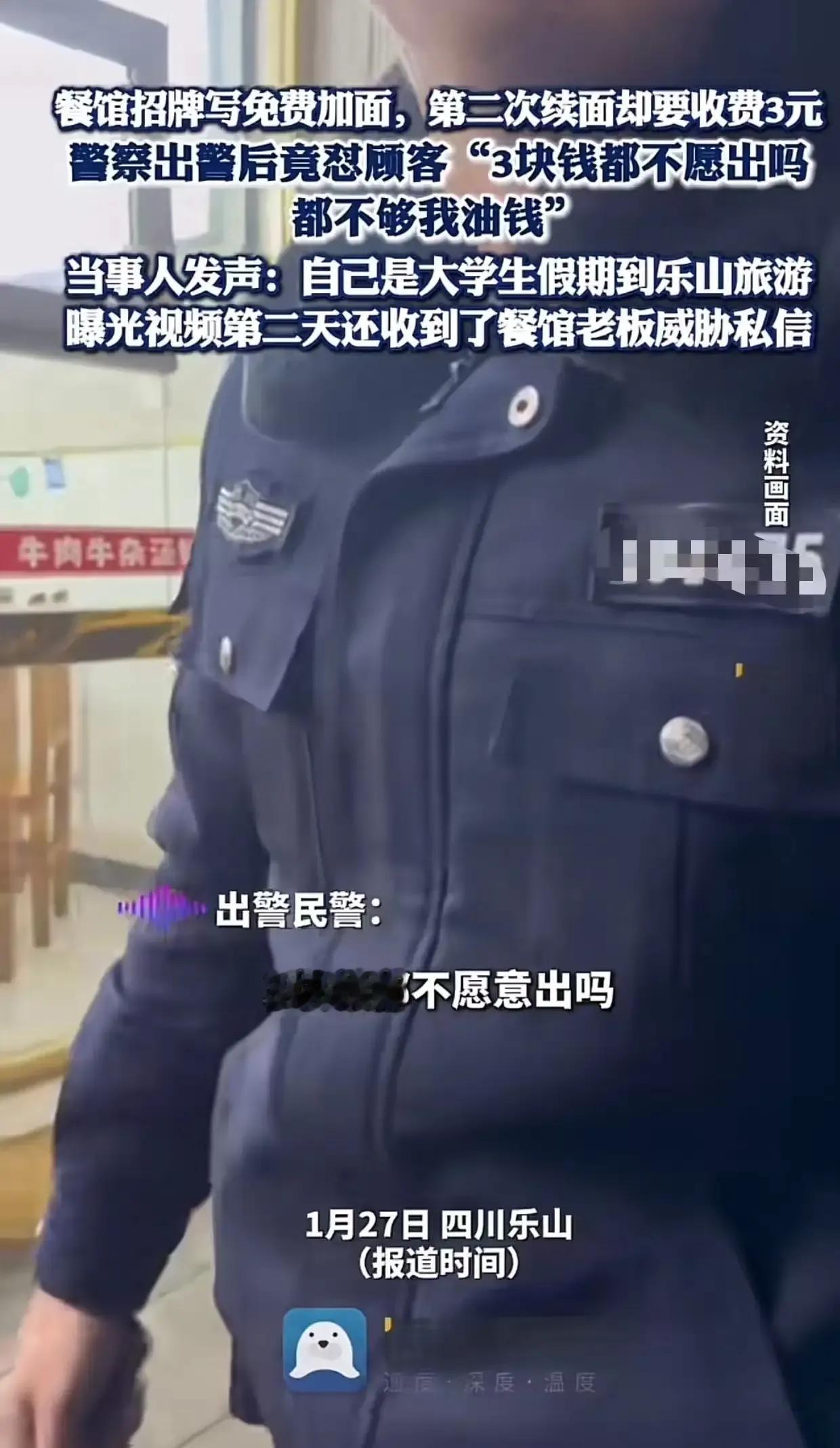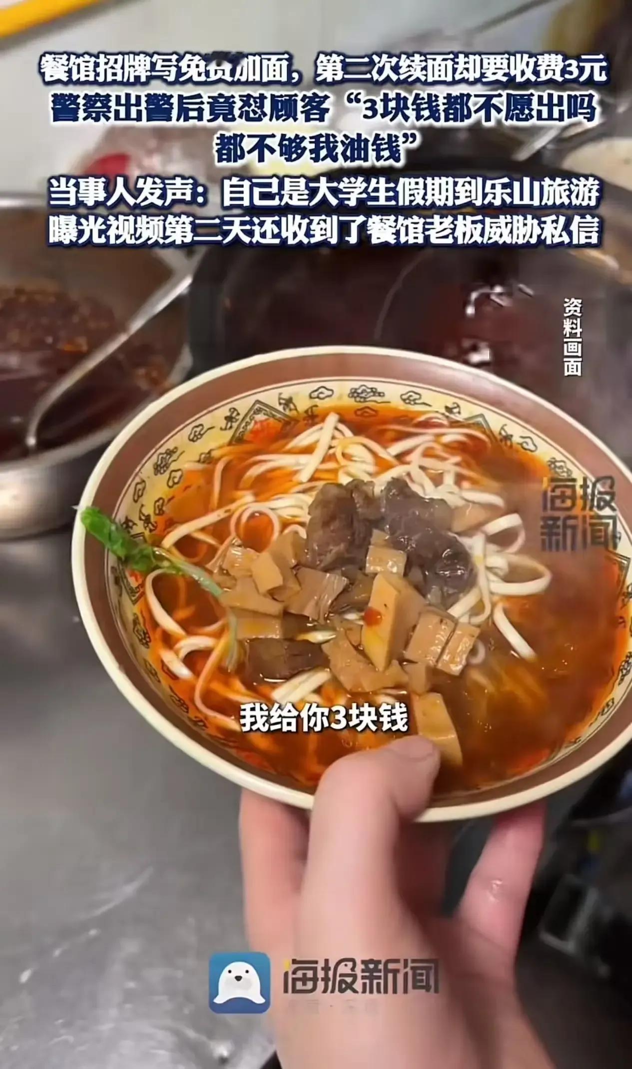 “乐山摊上大事了!”最近有大学生去面馆吃面,本想享受免费加面的福利,结果第二次续面时却被要求收费3元,这究竟是怎么回事呢? 据了解,这位大学生在乐山一家面馆用餐时,看到招牌上写着“免费加面”,便放心地点了一碗。然而,当他吃完第一碗,想要再加一碗时,却被告知需要支付3元的费用。大学生感到十分不解,认为面馆的做法与招牌宣传不符,存在欺诈行为。于是,双方发生了争执,甚至引来了民警。然而,民警到场后的处理方式却让人大跌眼镜。民警不仅没有支持大学生的诉求,反而帮着老板怼大学生:“你3块钱都不愿出吗?这点钱还不够我开到这里的油漆!”这句话一出,立刻引发了网友们的热议。有人认为民警的处理方式欠妥,应该公正执法;也有人认为大学生过于计较,3元钱并不是什么大数目。 这件事看似简单,却引发了大家对于诚信、公正以及消费权益的深入思考。究竟是大学生过于较真,还是面馆老板存在欺诈行为?欢迎大家在评论区留言讨论,一起分享你的看法!乐山餐饮店 乐山抄手