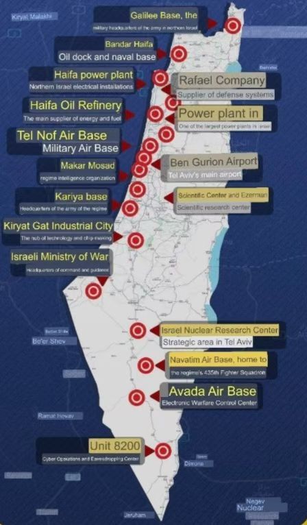 伊朗伊斯兰革命卫队公布了一张以色列地图, 同时强调, 伊朗的高超音速弹道弹有能力同时攻击数百个目标,包括十几个军事基地、炼油厂、摩萨德等情报总部和机场,有能力瘫痪以色列80%的军事机构。这算警告吧!国际局势海外新鲜事热点现场