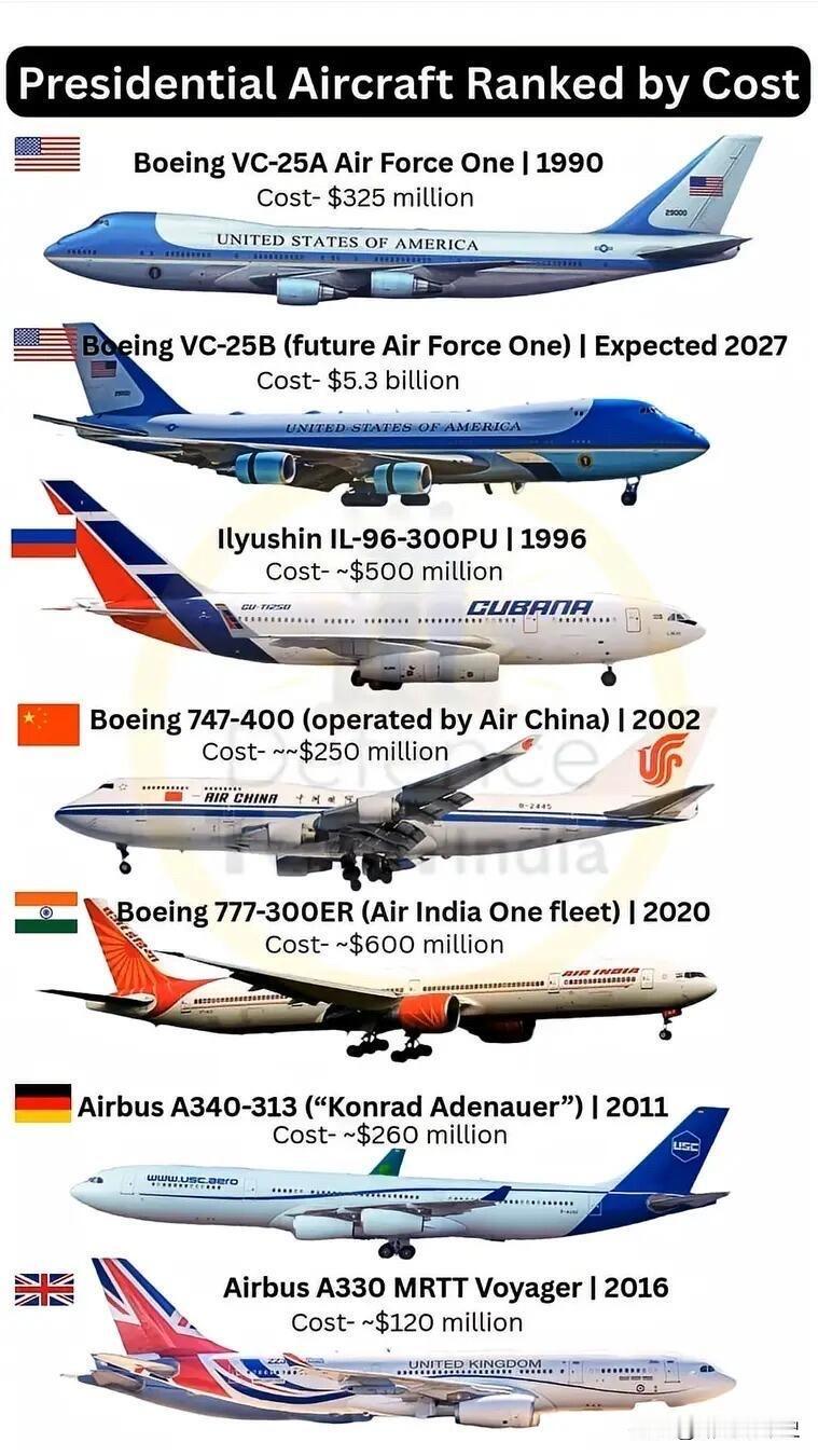 各国元首专机。VC-25B(未来的“空军一号”)造价达到了53亿美元,好夸张啊! 美总统专机 飞机