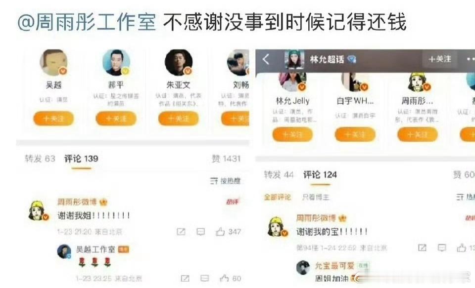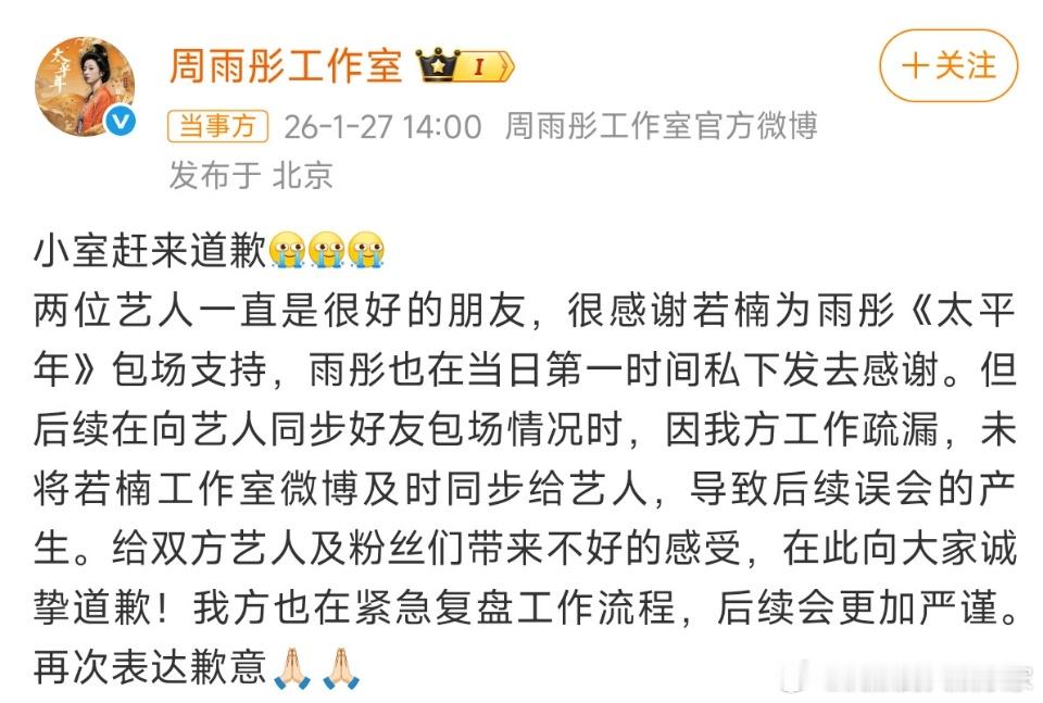 章若楠、吴越、林允三位艺人都为周雨彤主演的新剧包.场了,章若楠工作室是最早发布消息支持的,可周雨彤在23日、24日分别公开感谢了吴越和林允,却没提章若楠,这让章若楠的粉丝觉得自家偶像被区.别对待了,质疑声四起。1月26日,章若楠的一位粉丝以反讽的语气发文:“没关系的姐姐,相信这么大方的姐姐一定会给楠儿《冬去春来》包.场500座吧”,还艾特周雨彤工作室让其“记得还钱”。当天晚上,周雨彤回复该粉丝,称“楠儿真的很好,谢谢您”,并且承诺会包.场支持对方的新剧。27日周雨彤工作室发声明解释,原来是工作人员没把章若楠的微博同.步给周雨彤,所以她才没在社交平台公开致谢。实际上,周雨彤和章若楠是好友,当天周雨彤就私下感谢过章若楠了。周雨彤工作室道歉