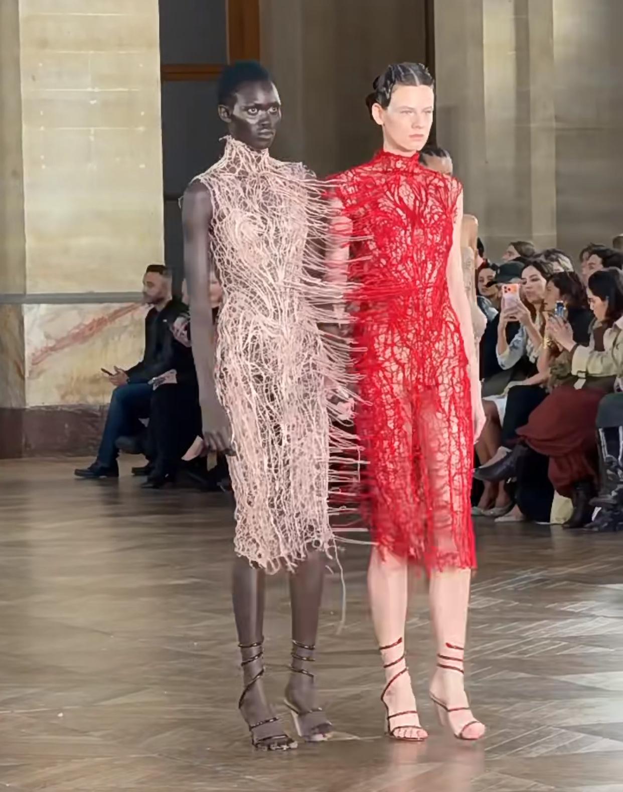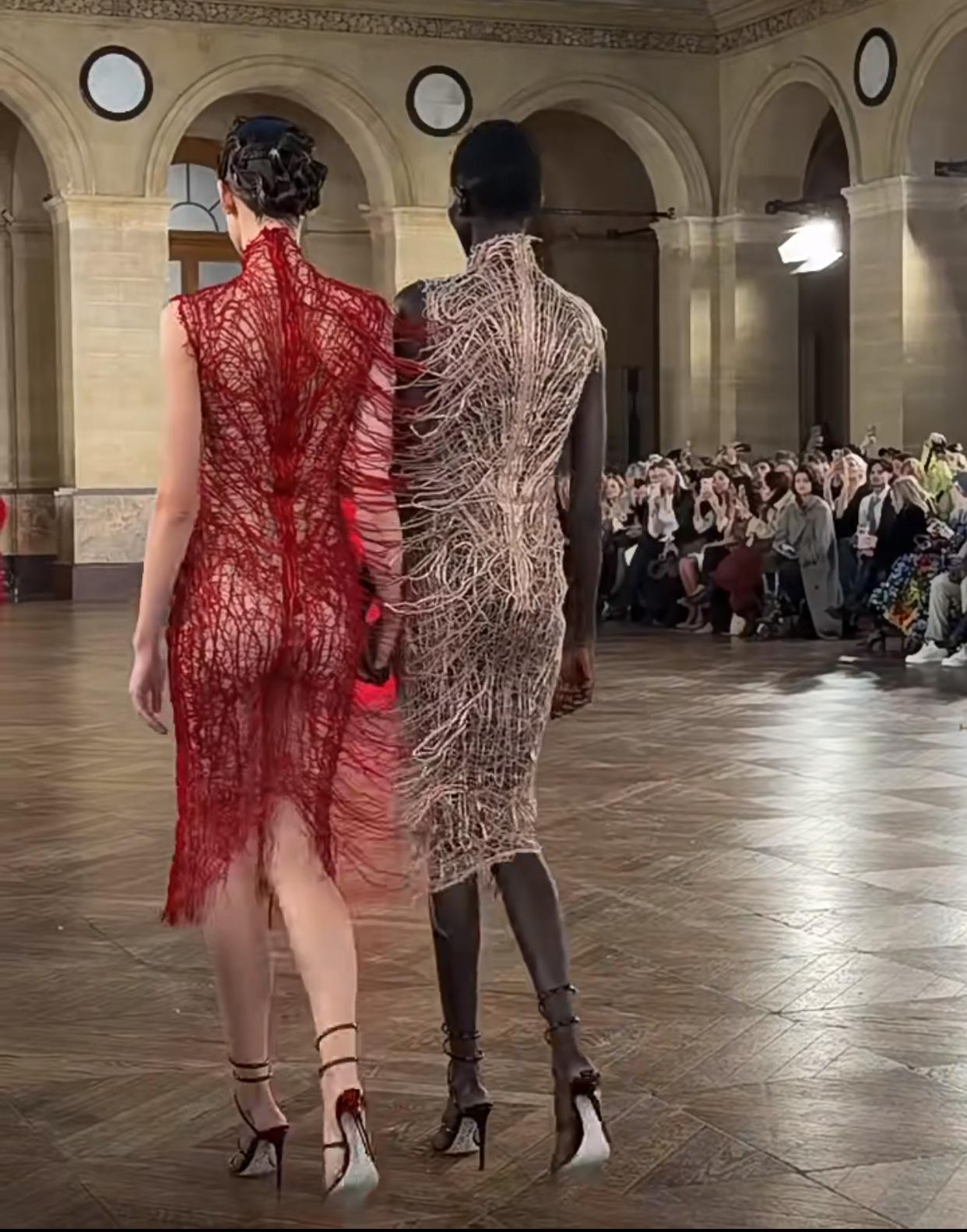 时尚界现在又玩儿起新花样来了,透视裙什么的都已经out了 现在流行“千丝万缕连体衣”,创意挺好,就是有点犯恶心 看起来像骨肉分离撕裂的的那一瞬间,也不知道她们是怎么穿上的 估计没有哪个女明星想要和别人穿一件衣服吧? 这件衣服销量估计有点困难了