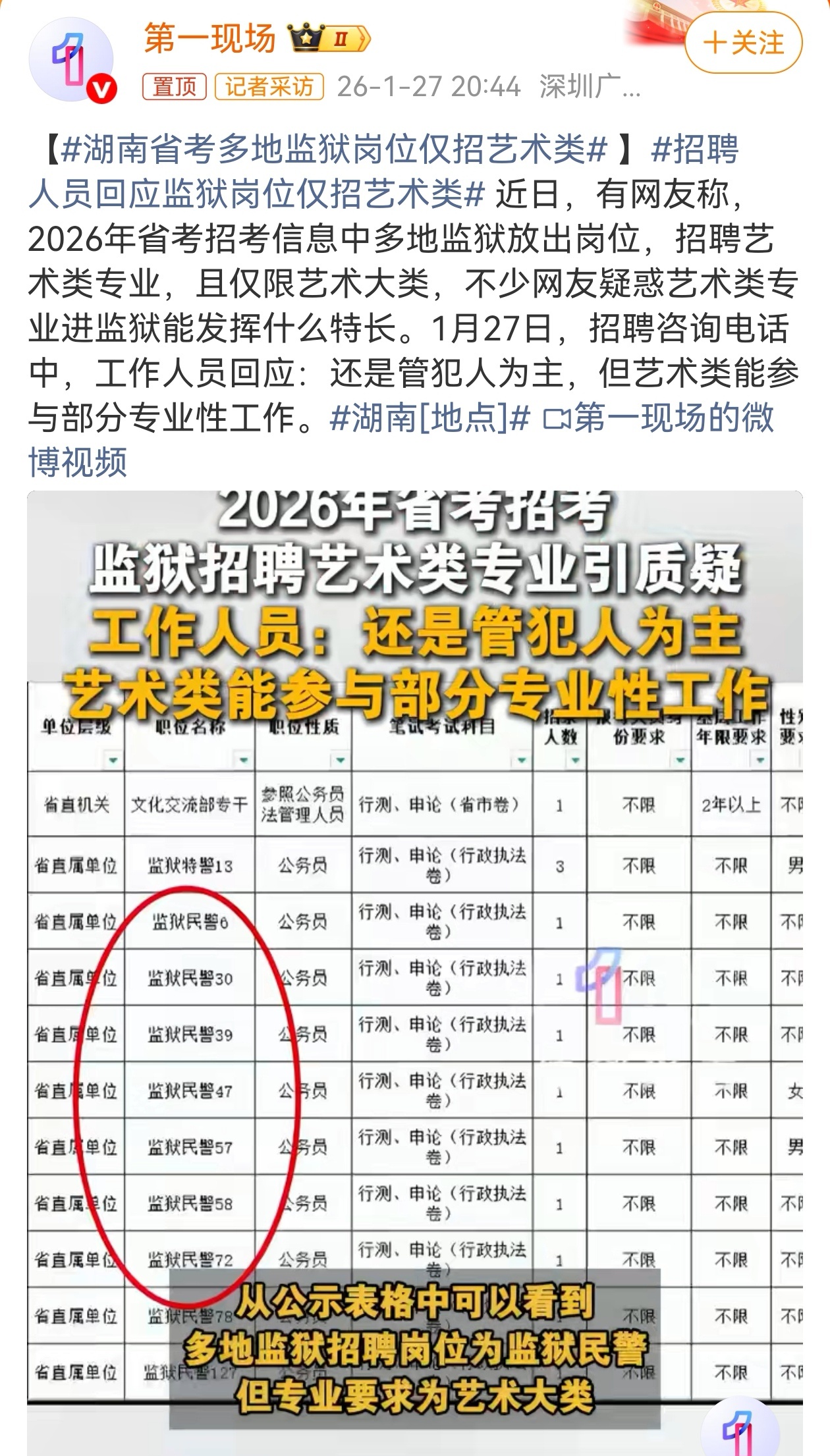 近日,2026年湖南省考招考信息中多地监狱岗位招聘仅限艺术类,引发“萝卜岗”质疑。事实上,监狱系统招录艺术类专业公务员,此前便长期存在过,相关岗位的设定,是基于罪犯教育改造的实际需要,除了开展文艺活动,丰富监狱文化生活,更好地帮助罪犯改造。湖南省考多地监狱岗位仅招艺术类时事满谈监狱系统相关岗位属于对内管理,不同于其他岗位的公务员,大众对于监狱日常管理工作的了解,多是源于影视剧的粗浅认识。网友对监狱岗位仅招艺术类存在质疑,关键在于招录过程是否公开透明、公平公正。湖南省考多地监狱岗位仅招艺术类