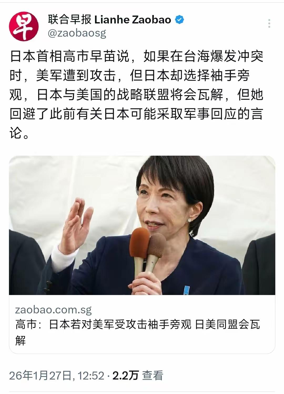 或许很快,中国与日本断交将是最大的可能。笔者这么说并非为了哗众取宠,而是这正是向我们走来的可预期的客观现实。在众多的理由中笔者只摘取两点进行证明: 一,我们翻看《中日联合声明》无论多少遍,都无法找到我们说的日本承认“台湾是中华人民共和国不可分割的一部分”这一立场的的表述,而“理解和尊重”中方这一立场的表述却清晰可见。但,“理解和尊重”在任何场合和任何情况下都不是“承认”。也即,日本并没有承认台湾是中华人民共和国不可分割的一部分。而承认台湾是中华人民共和国不可分割的一部分是我们与其他国家建交的基本原则。日本已不符合这个基本原则。 二,1月27日,《日本经济新闻》和《联合早报》都报道,高市在节目中谈及日本在“台湾有事”时称,“如果在台海爆发冲突时,美军遭到攻击,但日本却选择袖手旁观,只是逃跑,日美同盟就会瓦解”。看到吧,高市已经把“台湾有事就是日本有事”拓展到了“美国在台海有事就是日本有事”,日本全方位干涉中国内政的决心,在我方强烈反制下不但没有收敛,而是更加变本加厉,铁了心要插手台海局势,阻碍我们完成统一大业。 以上两点的第一点,日本不承认台湾是中华人民共和国不可分割的一部分;第二点,日本公开承认是我们的敌国。如若再与这样的日本存在外交关系就是对它对我内政进行干涉的纵容,是对我们自己的重大伤害。是时候结束这种状态啦。断绝与日本的外交关系已是我们的必然选择,而且,即使日后我们对日本重新做了彻底清算,也解除它的武装,也要永世不和它建交。