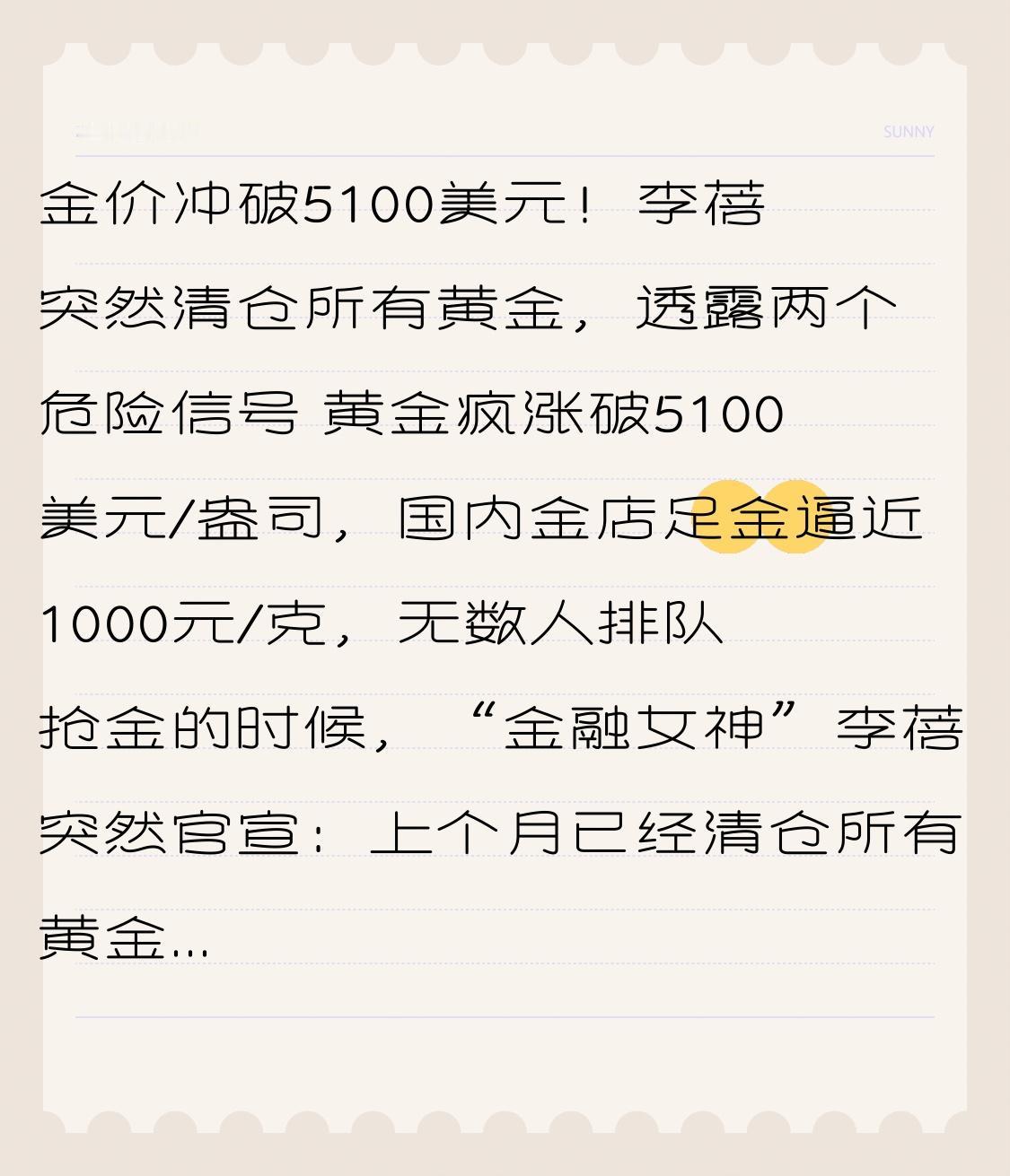 金价冲破5100美元!李蓓突然清仓所有黄金,透露两个危险信号 黄金疯涨破5100美元/盎司,国内金店足金逼近1000元/克,无数人排队抢金的时候,“金融女神”李蓓突然官宣:上个月已经清仓所有黄金仓位!这波逆向操作直接炸穿投资圈,有人算她少赚几十万,也有人慌了:难道黄金牛市要凉了? 要知道,这轮黄金牛市有多疯狂。从2025年至今,伦敦现货金涨幅超30%,央行、对冲基金、普通散户疯狂涌入,不少人喊出“破6000美元”的目标。可就在市场最狂热的节点,半夏投资创始人李蓓却选择“反向跑路”,她在专访中直言:“黄金未来10到20年都不值得投资,现在持有就是浪费机会。” 她的清仓理由藏着两个关键信号,第一个就让人脊背发凉:全球第五大黄金储备国俄罗斯,开始抛售黄金了。要知道,2000年以来黄金能一路上涨,核心逻辑就是央行持续购金,而俄罗斯2300多吨的储备规模,其转向被李蓓视为“长期周期逆转的警报”。此前菲律宾央行售金还只是小波澜,俄罗斯的动作直接动摇了牛市根基。 第二个信号更戳心:黄金已经严重高估。中金公司的定价模型显示,去年年底黄金估值残差达历史高位,早就偏离了“百年跑平通胀”的核心属性。李蓓坦言,不是黄金一定会跌,而是高位震荡的机会成本太高——她更看好未来两年中国顺周期蓝筹和地产板块的“十年一遇”机会,持有黄金只会错失更大收益。 可反转来了:李蓓清仓后,金价不仅没跌,反而又涨了20%,高盛等国际大行更是喊出5400美元的目标。一边是顶流基金经理的“看空出逃”,一边是机构的“疯狂唱多”,到底谁在说谎? 其实关键分歧在“短期”和“长期”。高盛认为,现在私人部门投资者正在接棒央行,对冲全球政策风险的需求会继续推高金价;而李蓓赌的是周期拐点,她觉得俄罗斯售金只是开始,后续可能有更多央行跟进,而且人民币升值背景下,人民币计价的黄金反而可能下跌。 最慌的还是普通投资者。有人跟着李蓓清仓后拍断大腿,也有人追高后遭遇日内暴跌100美元的惊魂时刻。评论区吵翻了天:“大佬的思路看不懂”“难道又是割散户韭菜?”“现在到底该买还是卖?” 李蓓的操作本质是逆向投资,她放弃短期上涨的黄金,押注尚在低位的顺周期板块,这本身就是一场豪赌。但对普通人来说,更该警惕的是“盲目跟风”——黄金疯涨时排队抢金,大佬清仓时又慌着抛售,往往只会踏错节奏。 投资的精髓从来不是追涨杀跌,而是看清核心逻辑。黄金牛市的支撑还在吗?俄罗斯售金会引发连锁反应吗?这些才是关键。李蓓的清仓或许不是警报,而是提醒:狂热市场里,保持理性比赚钱更重要。 你觉得李蓓是对是错?现在还能买黄金吗?评论区聊聊你的投资策略~