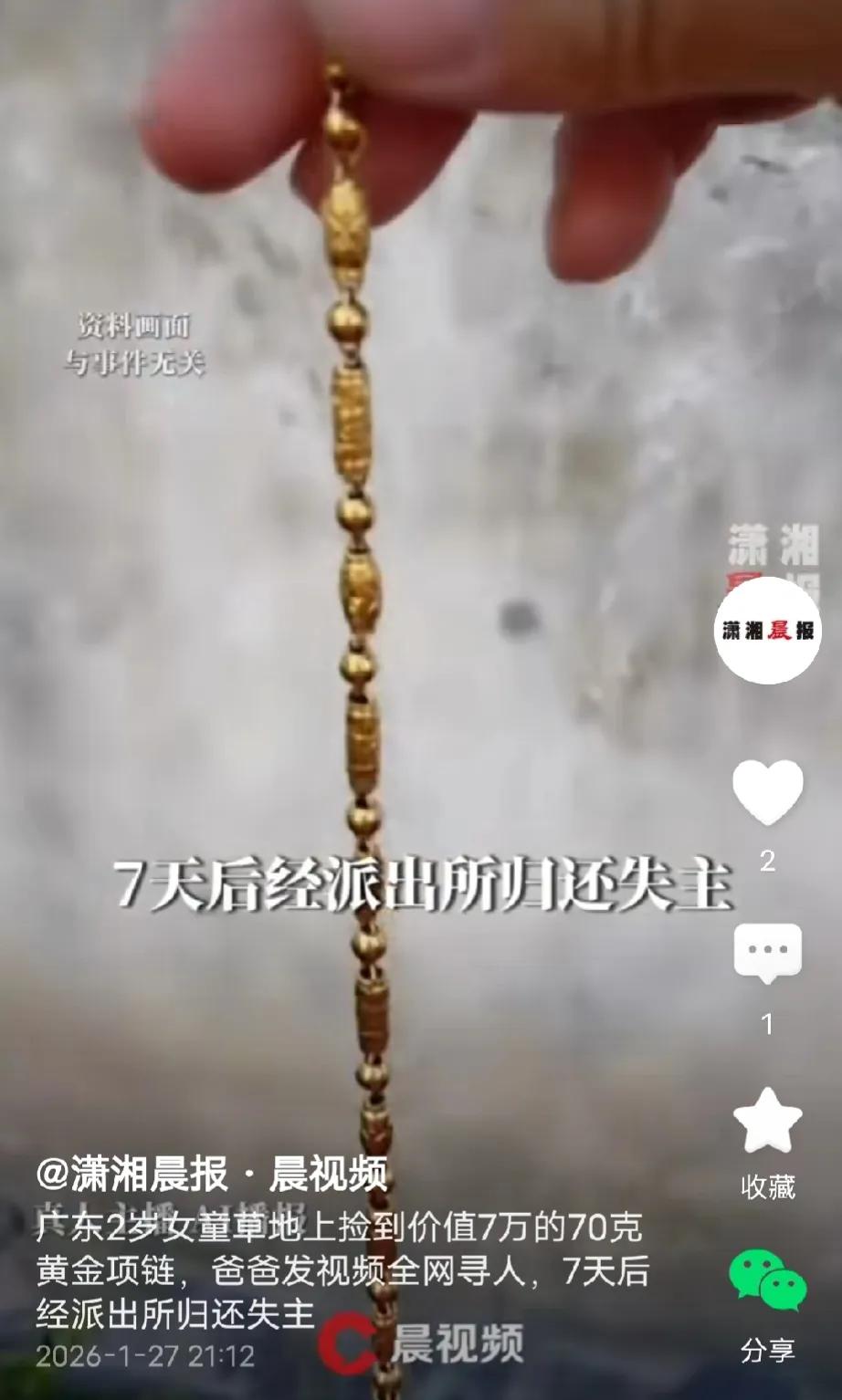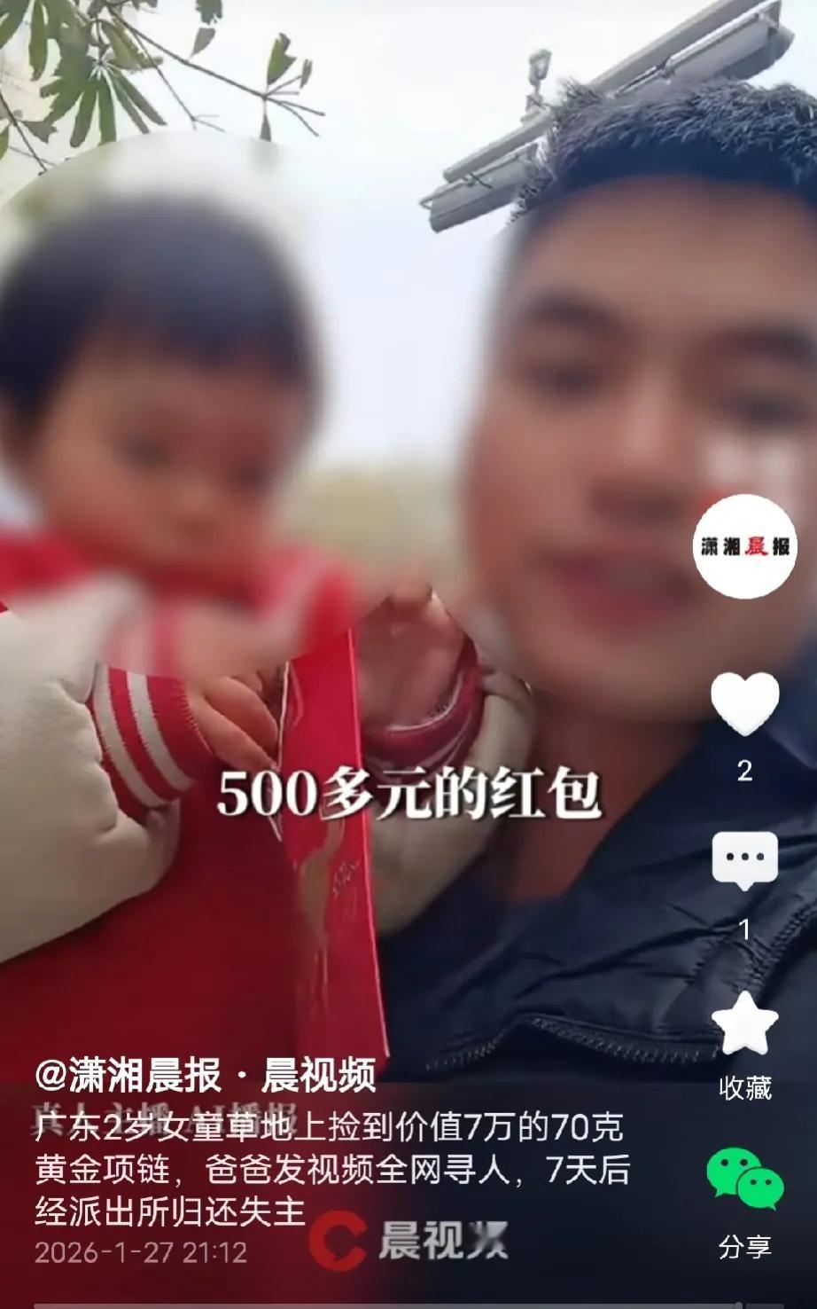 给这对父女点赞!广东佛山,男子带女儿出去玩,女儿突然在草坪上捡起一条链子,开始男子以为是假的,后来经过确认,发现是一条金链子,重约70克,市面价值大概7万元,男子赶紧发到网上寻找失主,后来派出所工作人员刷到后,联系了男子,把金链子还给失主,最终,失主一个举动让人意外。 1月18号那天,广东佛山的唐先生带他2岁的女儿出门玩。 孩子来到外面后,看着绿油油的草坪显得很开心,她一路跑着往前冲,唐先生跟在后面追。 不久后,女儿突然停下来,蹲在地上拿东西,一开始唐先生以为女儿在地上玩泥巴,等他走过去一看,看到女儿手上拿着一条金链子。 唐先生以为链子是假的,应该是哪个孩子带出来玩弄丢了,是不值钱的链子。 但,唐先生还是多留了个心眼,他从女儿手里拿过项链用打火机试着点了一下,发现是真的,他赶紧把项链收好。 回到家后,唐先生称了一下,项链重约70克,按照如今的金价算,项链大概值7万多块钱。 唐先生想到,这么贵重的东西,失主弄丢了肯定很着急,为了找到失主,他在朋友圈、在抖音发了寻找失主的消息。 一个星期后,也就是1月25号那天,唐先生接到派出所电话称,有人早前在丢了项链后就报了警,丢失的地方和唐先生捡到项链的地方对得上。 后来,唐先生又再次跟失主确认,发现项链的克重和外形,失主都描述得对,于是把项链还给失主。 记者采访唐先生时,他表示,失主和他是同一个镇上的老乡,他曾经来唐先生店里吃过饭。 失主拿回项链当天为了感谢唐先生和他的女儿,特意给孩子包了个500元的红包。 不得不说,唐先生和他女儿是真正的拾金不昧,他们这干净的人品,比7万的金链子还贵重。女儿小小年纪就跟着爸爸做善事,这才是最好的言传身教。 有人说,项链值7万多块钱,才包500块红包,要是换别人指不定直接揣兜里了,这失主也太会占便宜了! 这话听着糙但理不糙,7万的金链子失而复得,搁谁不得千恩万谢,拿个像样的谢礼?500块钱看着更像“意思一下”,寒酸得让人膈应。 但反过来想,唐先生拾金不昧压根就不是冲钱去的,他主动发圈找失主、配合派出所核实,图的就是心安理得。 倒是失主,占了大便宜还这么抠搜,属实没格局。 要知道人家父女俩守住的是良心,你这500块钱,可真算不上体面。 对此,大家怎么看?