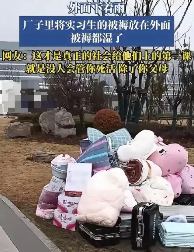 “长见识了!”安徽某电子厂,一群实习生将被褥和行李箱堆在厂区门口的空地上,随后便进厂报到了。谁知,他们进去没多久,天就下雨了,等实习生出来时,才发现被褥和行李箱全被雨水打湿了…… 安徽某电子厂门口的绿化带里,横七竖八躺着几十床棉被。这些被子吸饱了冬天的冷雨水,沉得跟吸满水的海绵似的,旁边还散落着几个发胀变形的纸箱。 这可不是什么先锋艺术展,而是几天前真实上演的“职场翻车现场”。看着那堆狼狈不堪的家当, 隔着屏幕好像都能闻到一股霉味儿和绝望感。 这不是简单的物理反应,而是这群年轻人“春节留守赚3倍工资”梦想的硬着陆。 就在这个春节前夕,一群还带着学生气的实习生,背着大包小包杀到了厂区。他们的算盘打得挺精:趁着过年留下来值班,拿着诱人的三倍薪水,给家里减轻点负担。想法很丰满,但现实的入职流程却很骨感。 填表、录指纹、领工牌、拿钥匙……这一套组合拳打下来,得在几栋大楼之间来回穿梭。看着脚边笨重的行李箱和铺盖卷,这群年轻人做出了一个致命的“减负”决定:把家当卸在门口空地上。 在他们的预判里,这片空地不妨碍车走,而且就在保安岗亭眼皮子底下,怎么看都是个“安全区”。于是,一个个两手空空,一身轻松地钻进大楼去跑手续了。 谁成想,老天爷的脸说变就变。 刚办手续那会儿还是多云,转眼间就泼下来一场大雨。等这帮孩子在大楼里走完流程,兴冲冲跑出来的时候,眼前的景象估计能让人心跳骤停:雨下了老半天,那些露天堆着的被褥早就湿透了,根本没法用了。 崩溃的情绪瞬间炸了,矛头直接对准了几米开外的保安岗亭。 在实习生的逻辑里,这简直是冷血至极——你们明明就坐在旁边,看一眼都知道要下雨,为什么不喊一声?哪怕搭把手挪一下呢? 面对质问,保安给出的理由硬邦邦的,却也挑不出毛病:忙着查验进出人员,顾不上。 实习生们气得跳脚,信誓旦旦地说当时除了他们这批人,厂门口根本没什么人进出。 但这里有个残酷的职场坐标系被忽略了。在保安的KPI里,守好大门、查身份证是雷打不动的“本分”,而照看红线外的私人物品,那是纯粹的“情分”。当本分和情分冲突,或者仅仅是因为那一刻人性的懒惰,他们选择了无视。 毕竟,也没有哪条员工手册规定保安必须充当临时保姆,对吧? 这事儿要是到这就结束了,充其量就是场小纠纷。但在这个流量为王的时代,镜头一剪,故事就变味儿了。 发布视频的人嗅觉很灵,直接抓住了“仇恨资本”的流量密码。在传上网的视频里,特意隐去了“实习生自己乱放行李”这个关键前提,把镜头死死怼在“淋湿的惨状”和“冷漠的保安”上。 一时间,网上的键盘侠们义愤填膺,把这当成了工厂没人味儿的铁证。舆论的雪球越滚越大,仿佛谁不骂两句资本家就是没良心。 直到当地警方的一纸通报出来,像个回旋镖狠狠砸在了舆论场上。 经调查,行李淋湿确实是物理事实,但发布者存在“借题发挥、编造散布谣言”的行为。所谓的“恶意针对”,不过是人为炮制的流量剧本。 舆论的风向瞬间来了个180度大转弯。网友们从最初的同情,变成了对“巨婴心态”的群嘲。 话虽然难听,但这确实是社会给这群实习生上的第一课。但这堂课的主题不是“人心冷漠”,而是关于责任的边界。 成年人的世界里,真没人有义务为你的草率决策买单。保护私有财产的第一责任人,永远是你自己。与其指望陌生人在暴雨中为你撑伞,或者指望保安盯着你的铺盖卷,不如先学会别把身家性命随便扔在露天赌运气。
