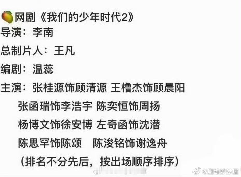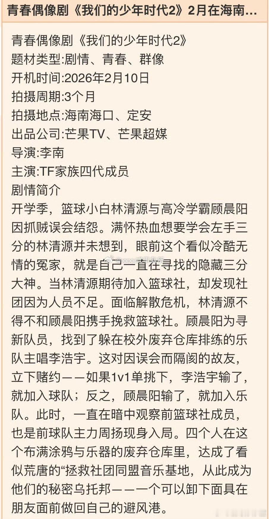 芒果《我们的少年时代2》招募跟组演员主演:TF家族四代成员(王橹杰 张桂源 杨博文 陈奕恒 左奇函 陈浚铭 张函瑞 张奕然 陈思罕 李煜东 魏子宸 杨涵博 聂玮辰 官俊臣都将出演)