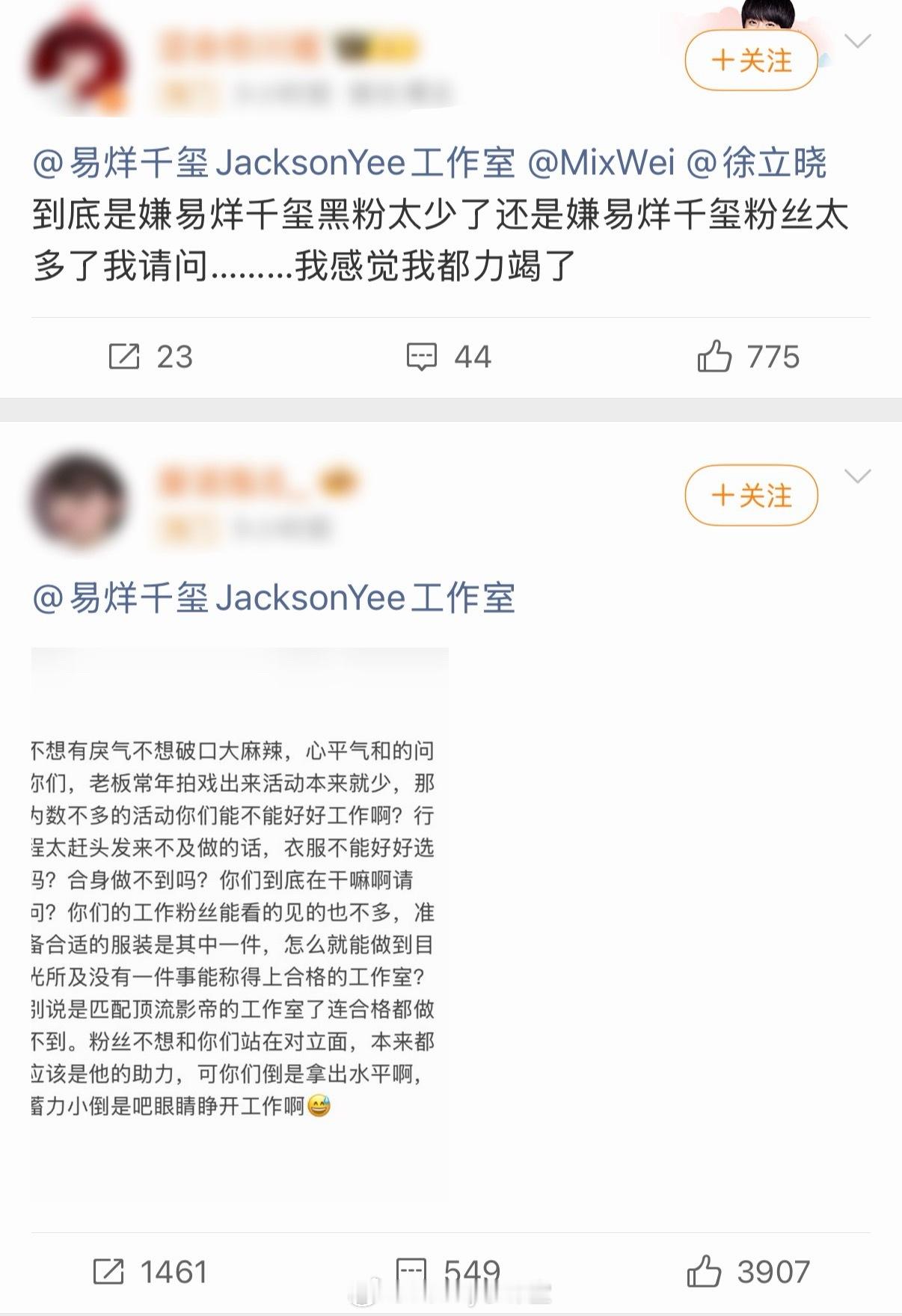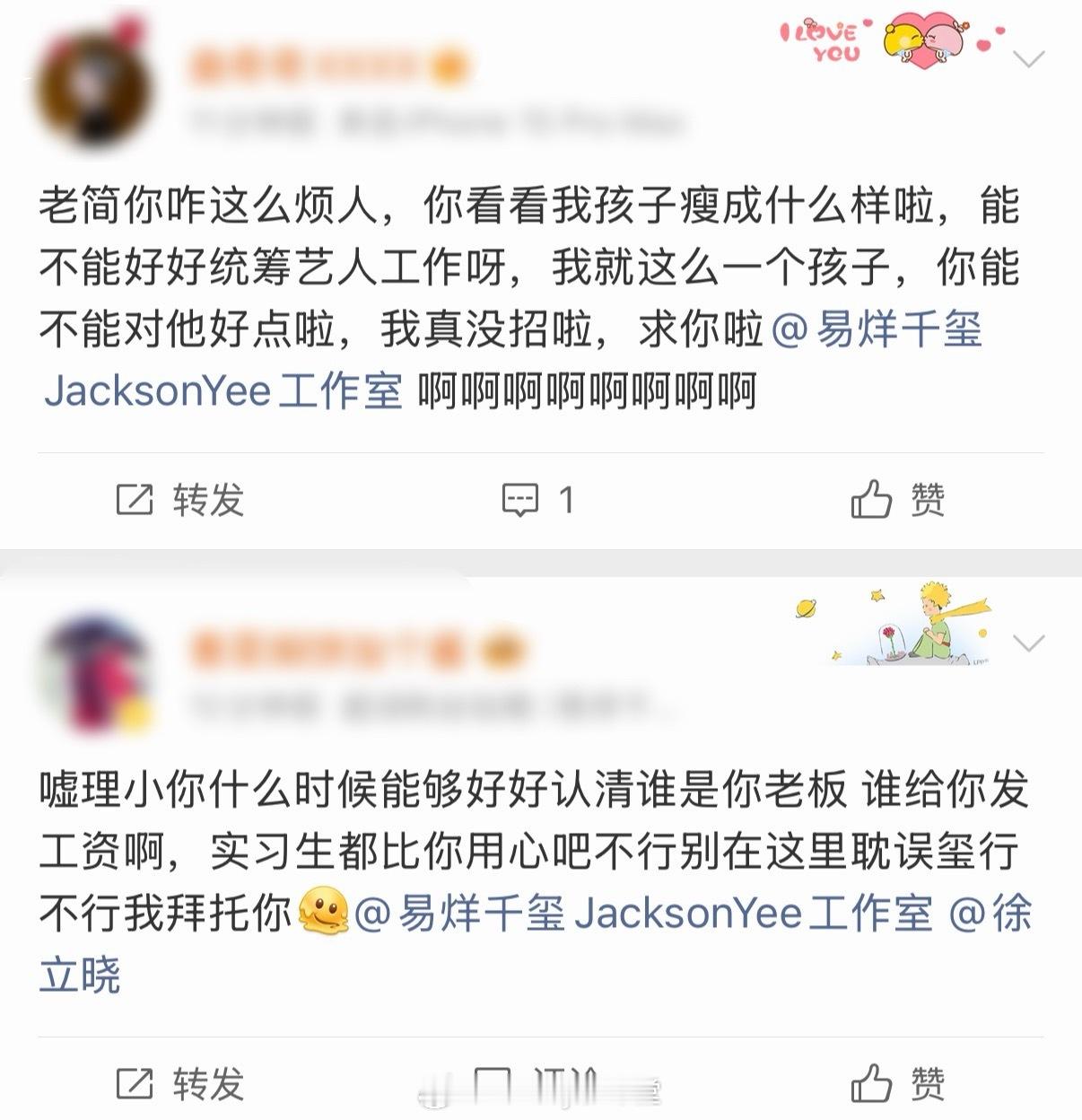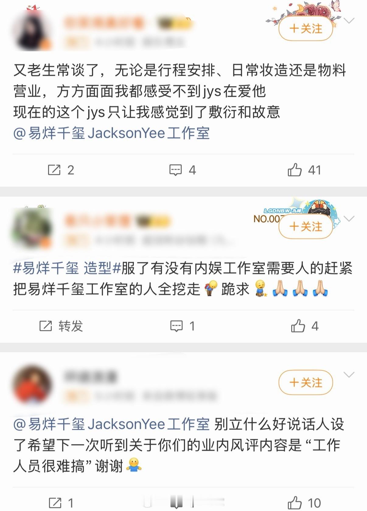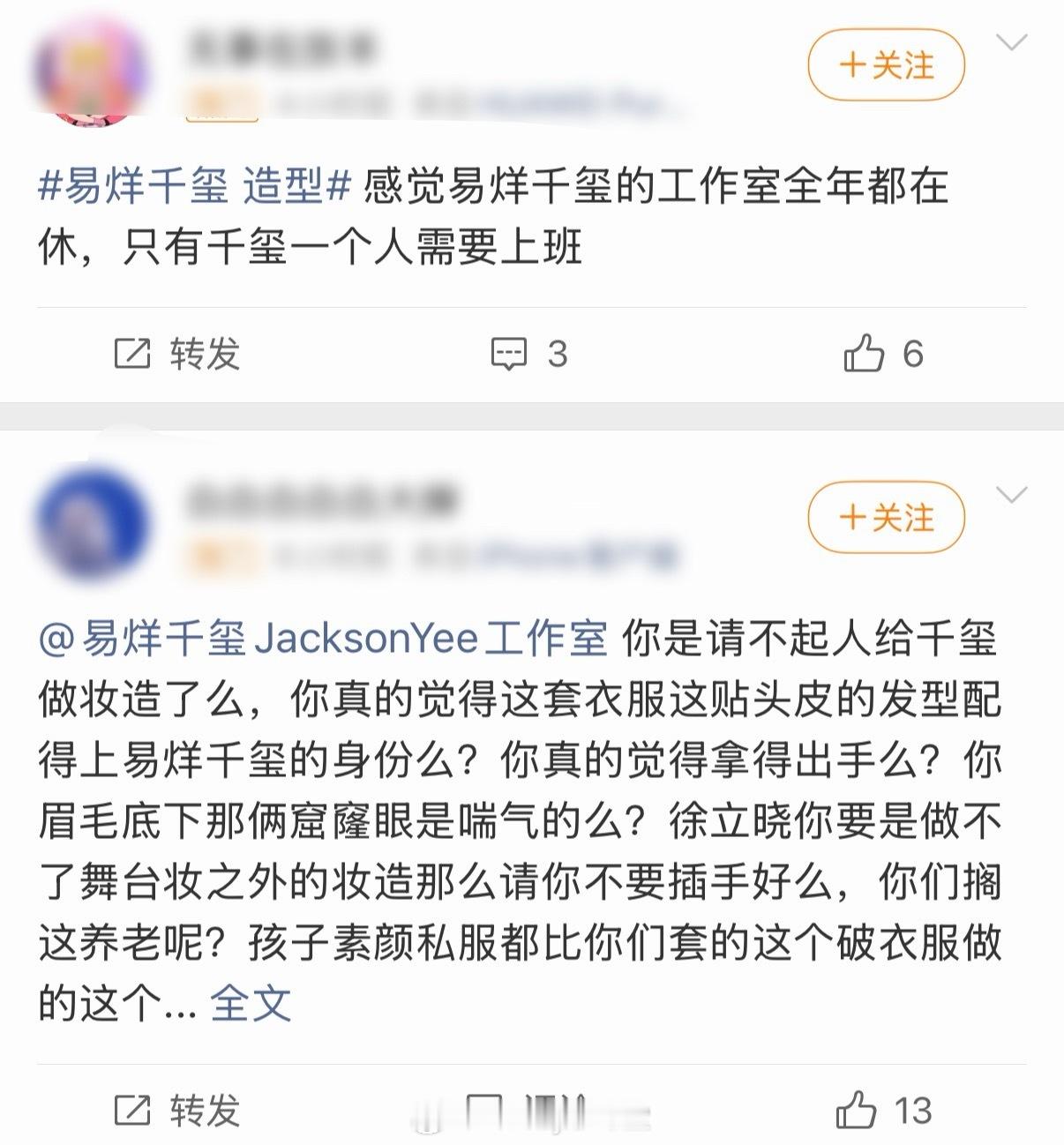 易烊千玺今天的舞台造型引发粉丝不满,粉丝要求工作室对易烊千玺好点,多上心……别的