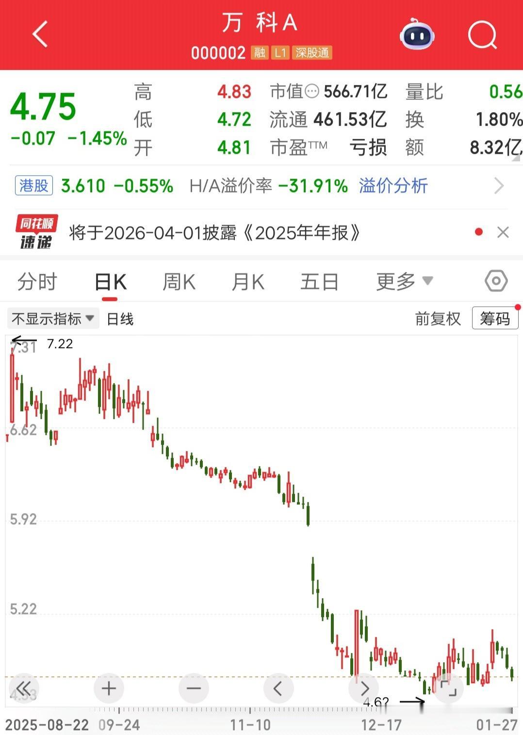 万科A好消息来了,深铁集团提供不超过23.6亿元借款,期限36个月,利率为2.34%。 利率2.34%是什么概念?1年期LPR为3.0%,企业贷款加权平均约2.88%,个人房贷更低也多在3.0%以上,2.34%低于普通贷款成本,常见于优质国企或股东低息借款 。 深铁是万科的第一大股东,确实很舍得借。而这已经是第12次借款了: 1. 2025-02-10:28亿元 2. 2025-02-22:42亿元 3. 2025-04-30:33亿元 4. 2025-05-15:15.52亿元 5. 2025-06-07:30亿元 6. 2025-07-03:62.49亿元 7. 2025-07-30:8.69亿元 8. 2025-08-05:16.81亿元 9. 2025-10-30:22亿元 10. 2025-11-11:16.66亿元 11. 2025-11-11后无新增公告(截至2025年底) 12. 2026-01-27:23.6亿元 万科的股价,经过一波杀跌后,目前是稳住了。不过看着有点悬呀,感觉还是会破新低的。 里面还有49.32万股东,万科的铁粉还是不少的,都是价值投资者。