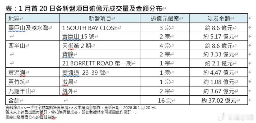 暴涨4倍创13年纪录!香港亿元豪宅开年被疯抢摘自Connor 香港直通车开年伊始,香港超级豪宅市场就交出了一份炸裂成绩单。国际资本与富豪新贵正加速抢占这座城市的稀缺资产。美联物业最新报告显示,1月首20日香港逾亿元一手超级豪宅成交量高达16宗,较去年1月全月仅3宗同比暴涨4.3倍,不仅超越2019年同期13宗的高位,更创下2013年一手销售条例实施以来的同期最佳纪录。量价齐升的背后,既是富豪对香港资产的坚定追捧,也折射出金融市场与财富流向的微妙变化。加速抢占数据显示,1月前20日逾亿元一手豪宅成交总值达37亿元,较去年同期4.7亿元飙升6.87倍,较2024年同期高位24.7亿元也高出49.8%,成为近十三年来1月最吸金的超级豪宅交易周期。区域集中度让人意外,八成半的逾亿成交均来自港岛。成交榜单上,多个标杆项目表现亮眼。天御第2期以4宗成交领跑,1SOUTHBAYCLOSE紧随其后录得3宗,两大项目均吸金8.6亿元;寿臣山15号、宝峰各贡献2宗成交,分别涉资5.17亿元、3.33亿元。单笔最高成交价则由蓝塘道23-39号一洋房创下,以4.47亿元的总价引起市场关注,仅剩的2宗成交来自九龙半山缇外,合共吸金3.67亿元。这一热度虽让人惊讶但也并非偶然。回顾2025年,香港豪宅市场已展现强劲承接力,全港一二手逾亿港元成交达169宗,涉资369.6亿元,成交宗数同比上升2.4%,其中一手成交占比近七成,港岛区成交占比高达73%。市场需求持续释放,为2026年的爆发埋下伏笔。超豪宅成交将再创新高面对开年的火爆行情,美联物业预判2026年逾亿元超级豪宅一手成交量,有望创下2013年一手销售条例实施以来的历史新高。多重利好因素叠加,正推动资金加速流入豪宅市场。首先是宏观环境的支撑。美国有望进一步实施减息政策,全球流动性宽松预期升温,低成本资金将更倾向于涌入兼具保值性与稀缺性的核心资产,香港超级豪宅无疑是优质标的。其次是本地市场氛围向好,2026年香港楼市整体气氛炽热,楼价延续升势,住宅交易投资畅旺,市场信心持续修复。更关键的是金融市场与供应端的双重助力。一方面,香港IPO市场有望维持活跃态势,港股走势向好将催生一批新富豪,为豪宅市场注入增量购买力;另一方面,香港超级豪宅长期处于“供不应求”状态,尤其是港岛核心地段的洋房、大平层,稀缺性不断强化其投资价值。市场风向标超级豪宅市场的冷暖,从来都是香港经济活力与资金流向的敏感“晴雨表”。其买家多为高净值人群与国际资本,这类资金对市场风险、经济前景最为敏感。开年成交暴增,意味着全球资本仍将香港视为安全的财富避风港,认可其国际金融中心的地位与资产保值能力。在经济复苏周期中,富豪阶层往往率先受益于金融市场上涨、企业盈利改善,而超级豪宅作为“终极资产”,成为他们锁定财富、对抗通胀的首选。近期港股市场的强劲表现,特别是IPO活动的回暖,直接创造了新的财富效应。值得注意的是,这波豪宅购买潮中,内地买家占比显著。豪宅市场的火热,还体现在租金上。莱坊2025年8月发布的《全球豪宅租金指数》显示,截至2025年6月底的12个月内,香港豪宅租金按年大涨8.6%,首次登上全球榜首,远超全球3.5%的平均涨幅。财富聚集香港豪宅市场的火爆,背后是全球资本和人才的持续流入。此前花旗香港的调查显示,香港2025年拥有1000万元总资产净值及至少100万元流动资产的“千万富翁”人口约39.5万人,较去年增加约5000人,占香港21-79岁总人口的约7%。而致同香港会计师事务所《香港财富管理热潮:引领全球市场新格局》报告指出,2025年上半年,香港拥有逾3000万美元资产的超级富豪人数激增22.9%,达17215人,成为全球顶级财富市场中增幅最大的地区。香港凭借强劲的资本涌入、家族办公室的增长、金融科技创新以及与大湾区的深度融合,正加快迈向超越瑞士,跃升为全球最大的跨境财富管理中心。而房产便成为海量新增财富的核心承载体。对富豪而言,香港超级豪宅的吸引力远超居住属性,更兼具多重价值。香港土地资源稀缺,尤其是港岛传统豪宅区的可开发土地几乎耗尽,导致顶级豪宅供应极为有限,“卖一套少一套”成为趋势。此外,香港完善的法律体系、自由的资金流动机制,也让超级豪宅成为国际富豪配置跨境资产的优选。香港豪宅市场,已不仅仅是房地产交易,更是国际资本流向的风向标和财富安全的避风港。展望2026年,随着多重利好持续释放,香港楼市有望延续火热态势,成交纪录或将被持续刷新。而这场热潮,最终也将转化为香港经济复苏的强劲动力。