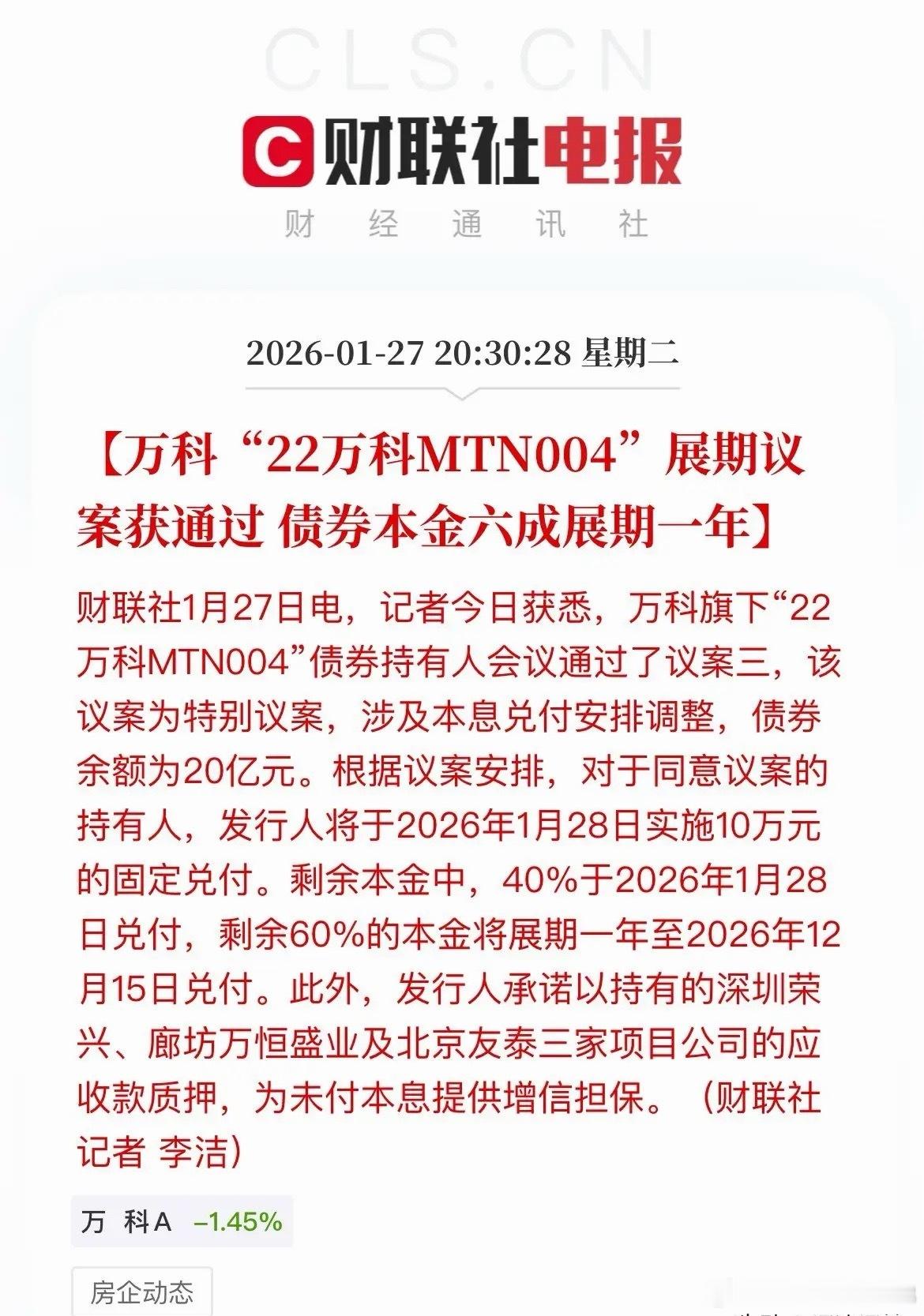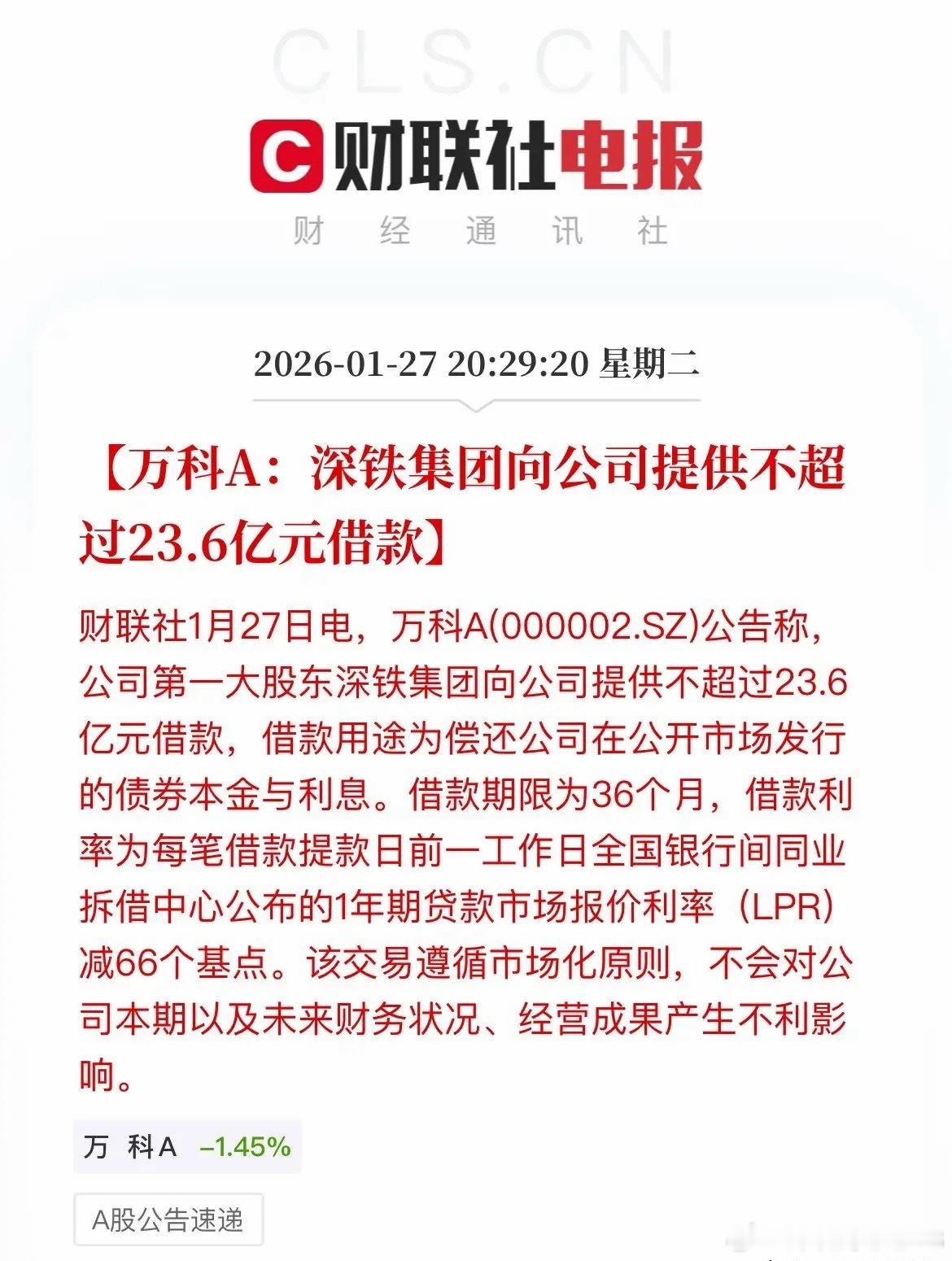 万科利好,债券展期获得延迟,另外深圳地铁又再度给万科输血了,提供不超过23.6亿元的借款这算是让万科又缓了一口气了,钱有了,债还能拖一拖,过完年再说吧。