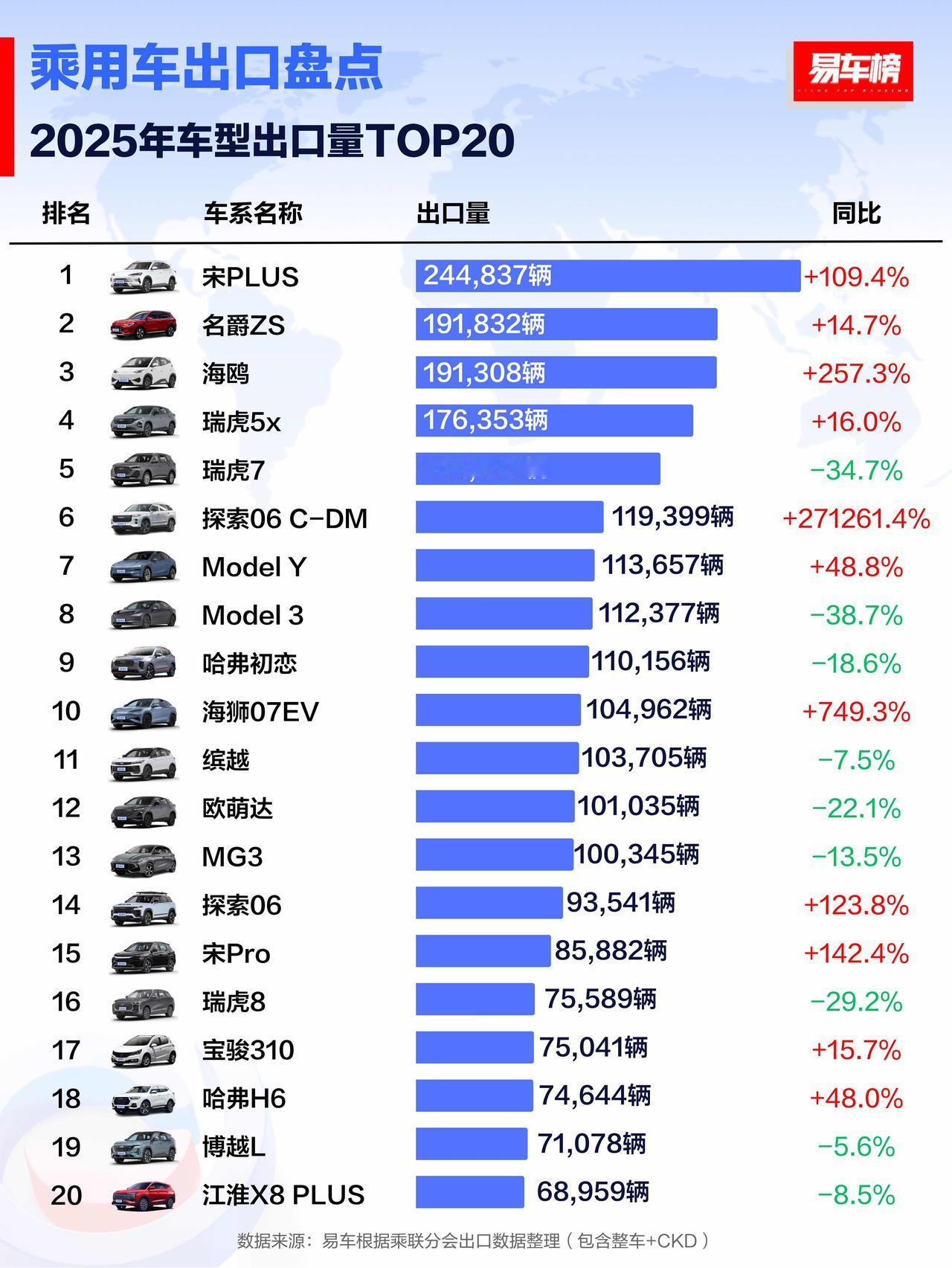 2025年乘用车车型出口量TOP20新鲜出炉! 第1名:宋PLUS(24.4万,+109.4%)断层领跑; 第2名:名爵ZS,第3名海鸥(+257.3%)紧随其后; 第4名瑞虎5x、第5名瑞虎7稳扎稳打; 第6名探索06 C-DM同比暴增271261.4%,杀疯了; 第7名Model Y、第8名Model 3、第9名哈弗初恋、第10名海狮07EV(+749.3%)强势入榜! 汽车销量 汽车出口 宋plus 瑞虎5x