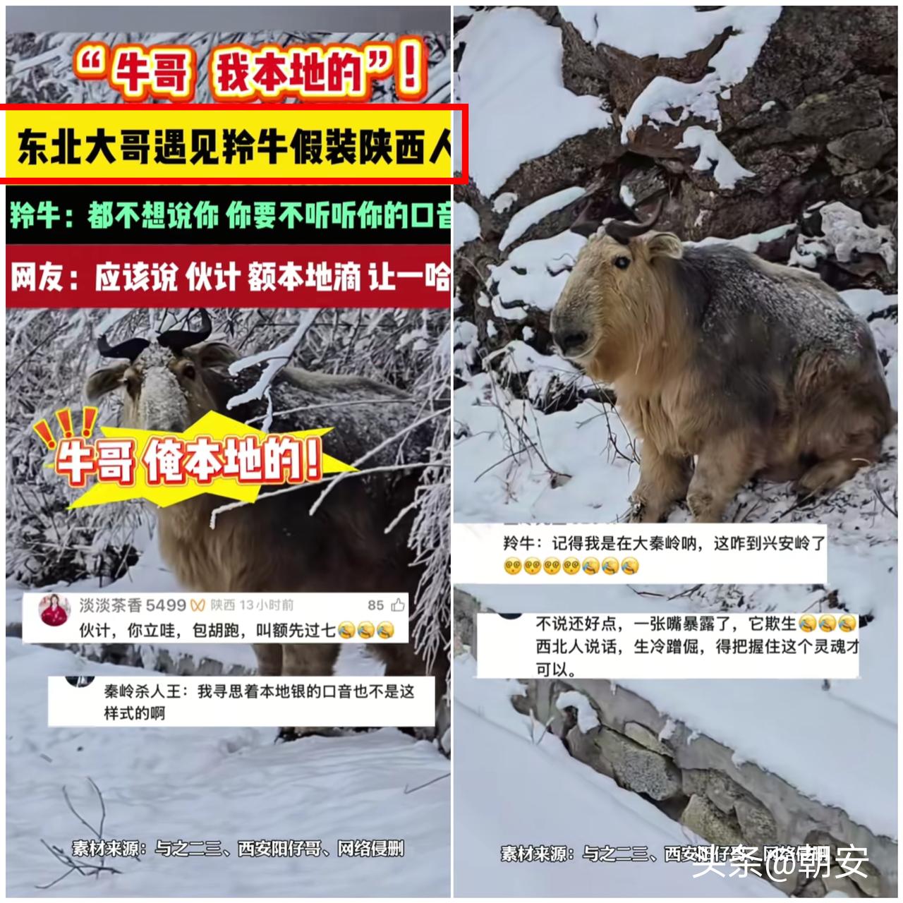 笑不活了! 西安雪地里东北大哥遇上羚牛,张口就来“大哥我本地的,让个道”,结果 羚牛直勾勾盯着他,那眼神跟看穿了假本地人似的,隔着屏幕都觉得好笑! 东北人的自来熟真的刻进DNA了,就算面对野生羚牛,也忍不住想唠两句,这波操作属实是把幽默焊在身上了。 但笑归笑,可别学这位大哥的大胆,羚牛可不是软萌的小动物,它是国家一级保护动物,看着呆萌,实则脾气爆还犟,连农村厕所墙都能撞塌,近距离接触真的超危险。 大哥这次能全身而退,全靠躲在车里,这要是站在跟前,后果不堪设想。 现在秦岭生态越来越好,野生动物现身人类活动区成了常态,这是好事,但人和动物相处,最该懂的就是保持边界。 热情和幽默用对地方才可爱,对着野生动物耍宝,其实是拿自己的安全赌运气,尊重它们的领地,保持安全距离,才是真正的相处之道。 话说回来,要是你偶遇这种大型野生动物,第一反应会是啥?