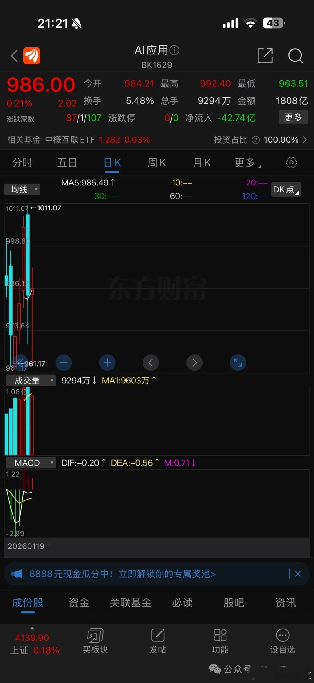 早上一度出现冰点,上涨家数仅700出头,一月以来最低值。所以早上某队是没有继续压盘的。不过随着市场扛住回暖之后,尾盘又是一波组合拳,照这个速度,估摸着下周就会出清了。市场轮动的很快,没什么亮点,个股到了高位波动也巨大,持有类似湖南白银、白银有色等个股,就很难不在波动的恐慌之中被量化来回收割。唯一的亮点是AI应用板块看起来应该是调整到位了,两根金针探底的组合K,后面就看反包左侧大阴线的时间和力度了。这一波的两个灵魂,一个是容量蓝色光标,另一个就是绝对高度志特新材,有高度有纵深,关注看如何演绎。这一波没有强行jg打断之前,基本走的都是不断超预期的主题投资,起初是十五五走出了统一题材,再到以为是补涨的航天,结果持久度、参与度更强更烈;然后是ai应用,也是补涨之姿,四天就捅翻倍,然后连续降温打断。最困难的过去了,看如何吧。另外就是龙回头,平潭发展今天反包再涨停,应该是止住了,那么之前的资金应该都会有一个龙回头的博弈。