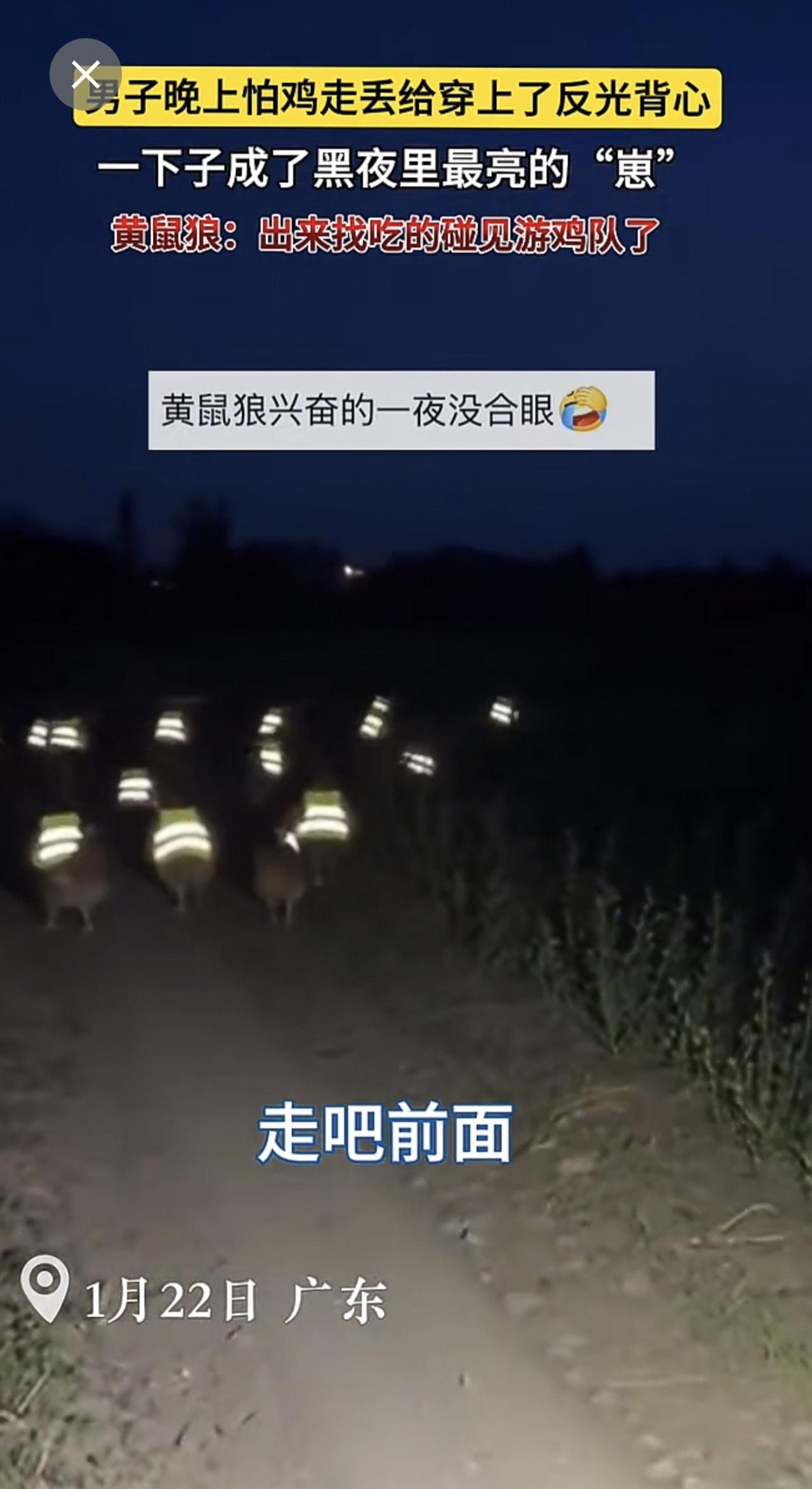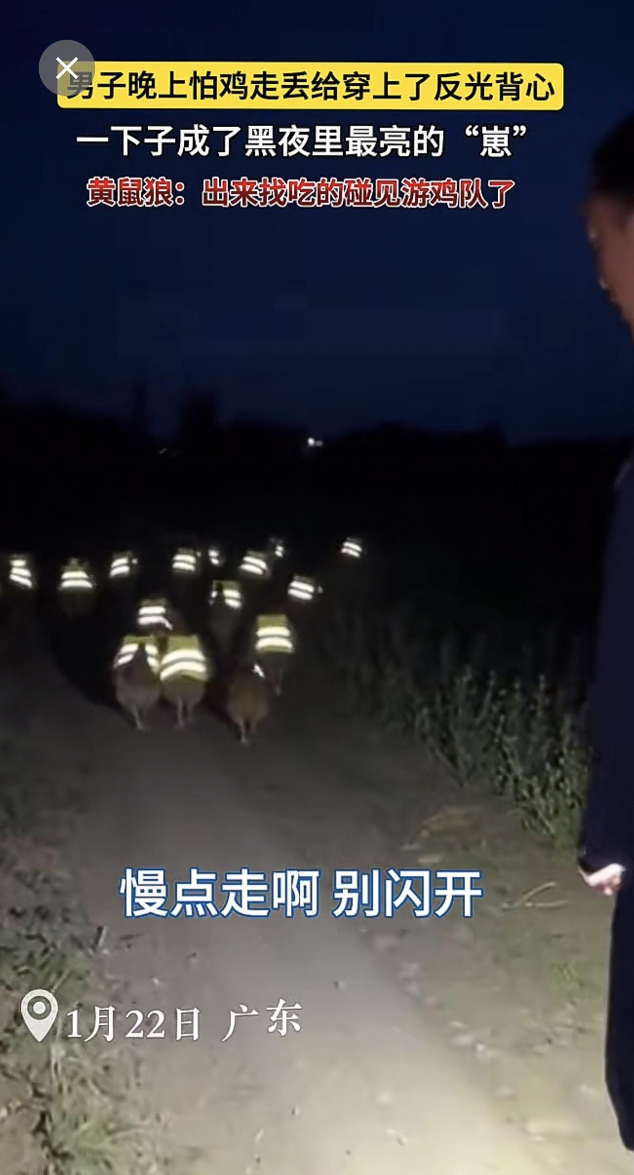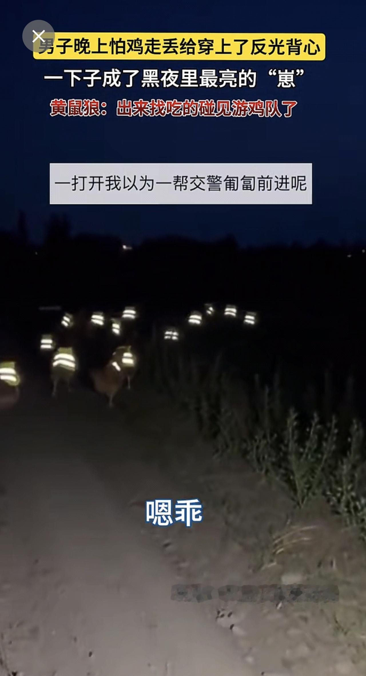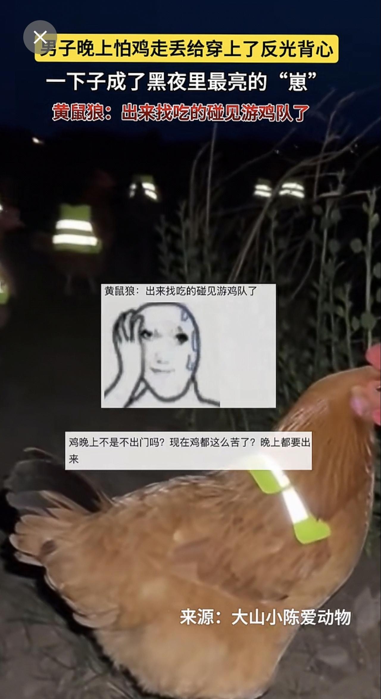 男子晚上怕鸡走丢给穿上了反光背心🦺。一下子成了黑夜里最亮的“崽”~黄鼠狼:出来找吃的碰见游鸡队了!(来源:大山小陈爱动物 )
