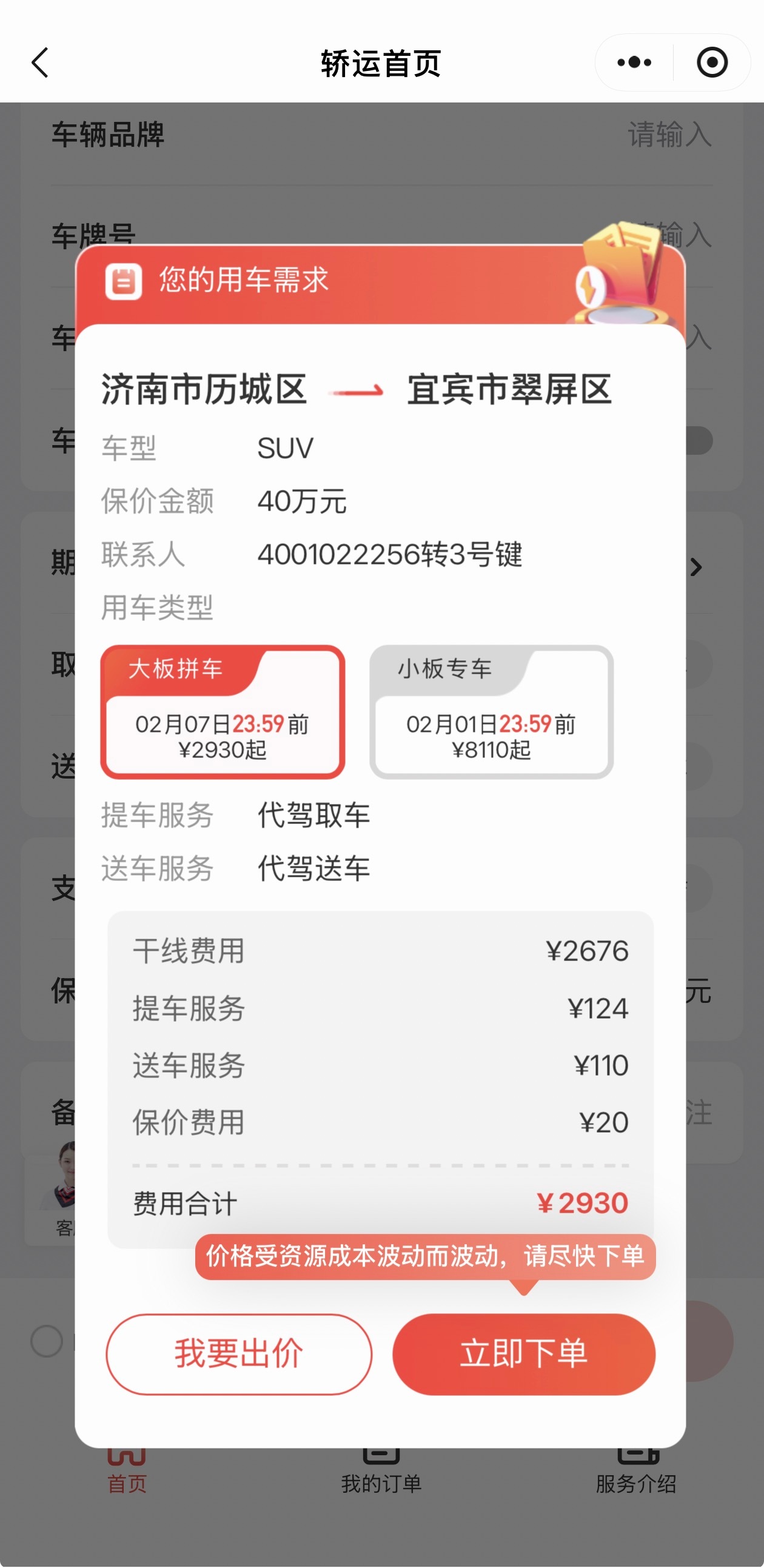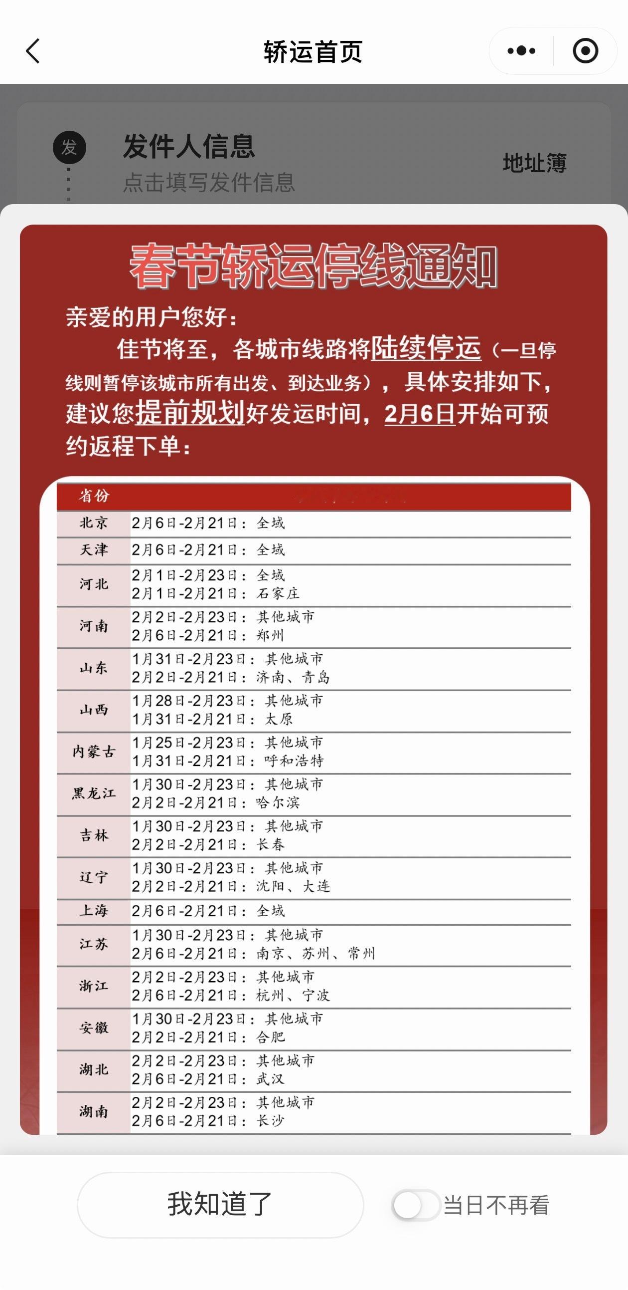 12306有托运汽车服务了,不过我选了几个地,都没有现成的线路,需要进行线路定制热门线路有柳州到郑州、兰州、芜湖,乌鲁木齐到成都和重庆,价格其实还可以,比大板拼车便宜没有现成线路,我又试了试顺丰托运。是的,就是做快递的那个顺丰,它们也有托运车服务进去先弹出不同地区托运服务截止时间,济南2月2日起就春节停线了。选了下时间和来回托运城市,大板拼车回老家,2930,来回大概6000的样子如果不想很累开长途回家,其实托运是种选择,租车随便租个好点的6座的车,春节期间也不止这点钱12306托运汽车订单火爆