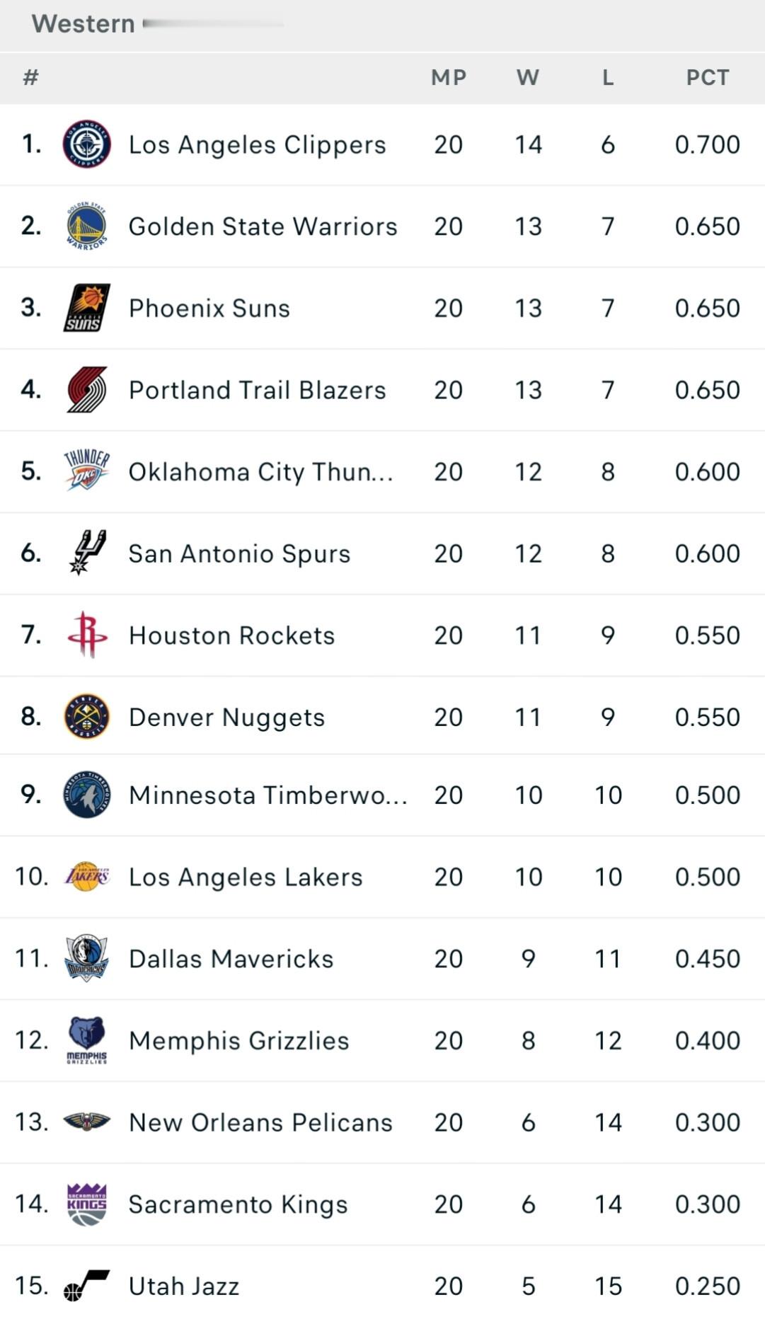 刷到一个数据 这是西部最近20场比赛的排名 巴特勒受伤前 勇士本来开始往前冲的