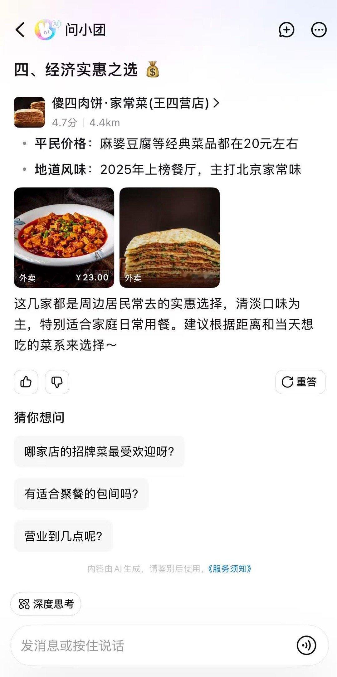 这个美团AI搜索“问小团”上线之后,带爸妈出去玩更方便了!像他们不爱吃网红店,口味也比较淡!我就试着在问小团上问:“本地人常去的实惠家常菜馆,要符合大众的口味,最好是清淡一点”,推荐的几家果然味道正、价格实在,被爸妈夸了好几天会找地方。老人家的喜好,它也懂。生活问题问美团都安排