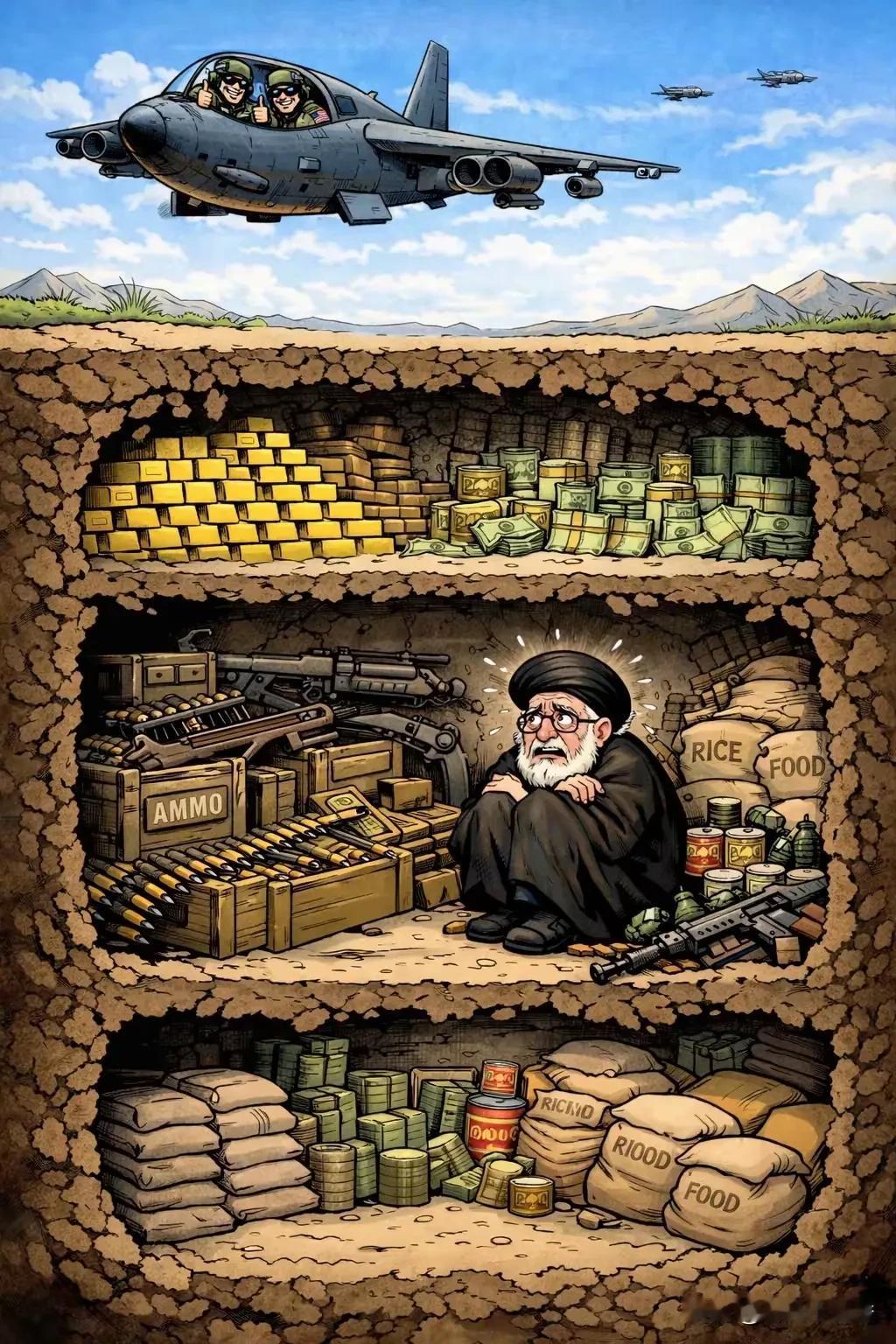 最近看到一幅漫画“躲在地堡里的哈梅内伊”,还挺有深意的。美伊冲突风险越来越高,特朗普对伊朗格外“上心”,美军中央司令部老大都亲临前线。据报道,哈梅内伊躲进了地堡。有个场景很有意思,他躲进地洞时,德黑兰上空民航客机乘客看到城南山体滑开,之后全城高层手机没了信号,网线都被拔了。他儿子马苏德成了唯一传递消息的人,靠手写纸条坐老标致405传递信息。而美国那边动作不断,伊朗也不示弱,在革命广场画航母残骸壁画。这漫画也反映出当时紧张的局势啊。