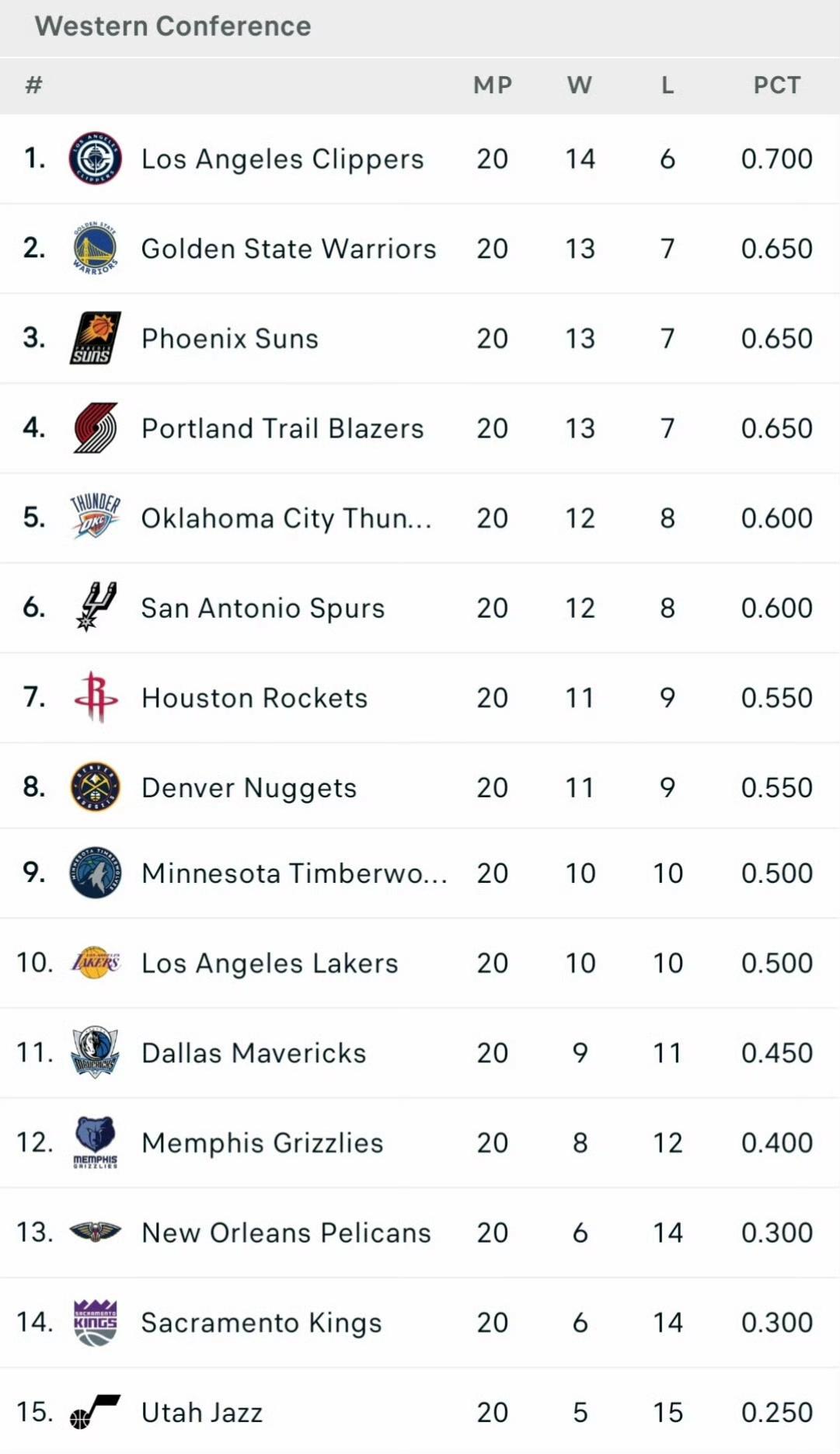 西部最近20场比赛的排名,快船排名第一、勇士排名第二,可惜这是巴特勒受伤之前的数据,不然勇士还能更好。 令人意外的还有开拓者排名第四,湖人仅排名第10。