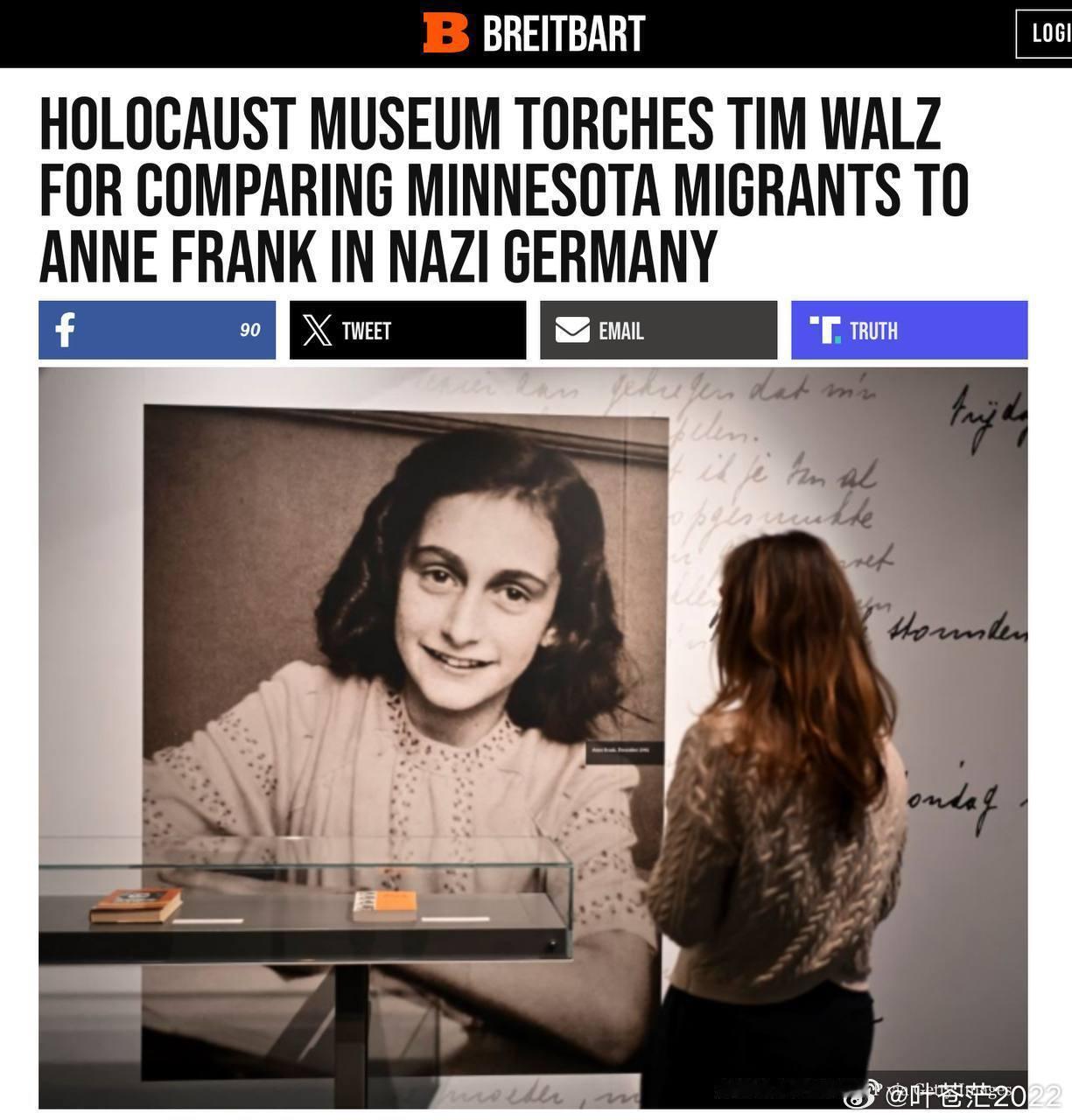 Tim Walz在周日的新闻发布会上声称明尼苏达州的孩子们躲在家中,并提到了Anne Frank的故事,呼吁川普总统撤回ICE和边境巡逻人员。美国大屠杀纪念馆批评Tim Walz将ICE在明尼苏达州的执法行动与纳粹德国相提并论,并指出Anne Frank仅仅因为她是犹太人就被当作目标并被杀害,“利用大屠杀事件进行类比是极其冒犯的”。这种比较是“出于政治目的”而进行的“错误类比”,是“绝不可接受的”,尤其是在反犹主义日益猖獗的当下。